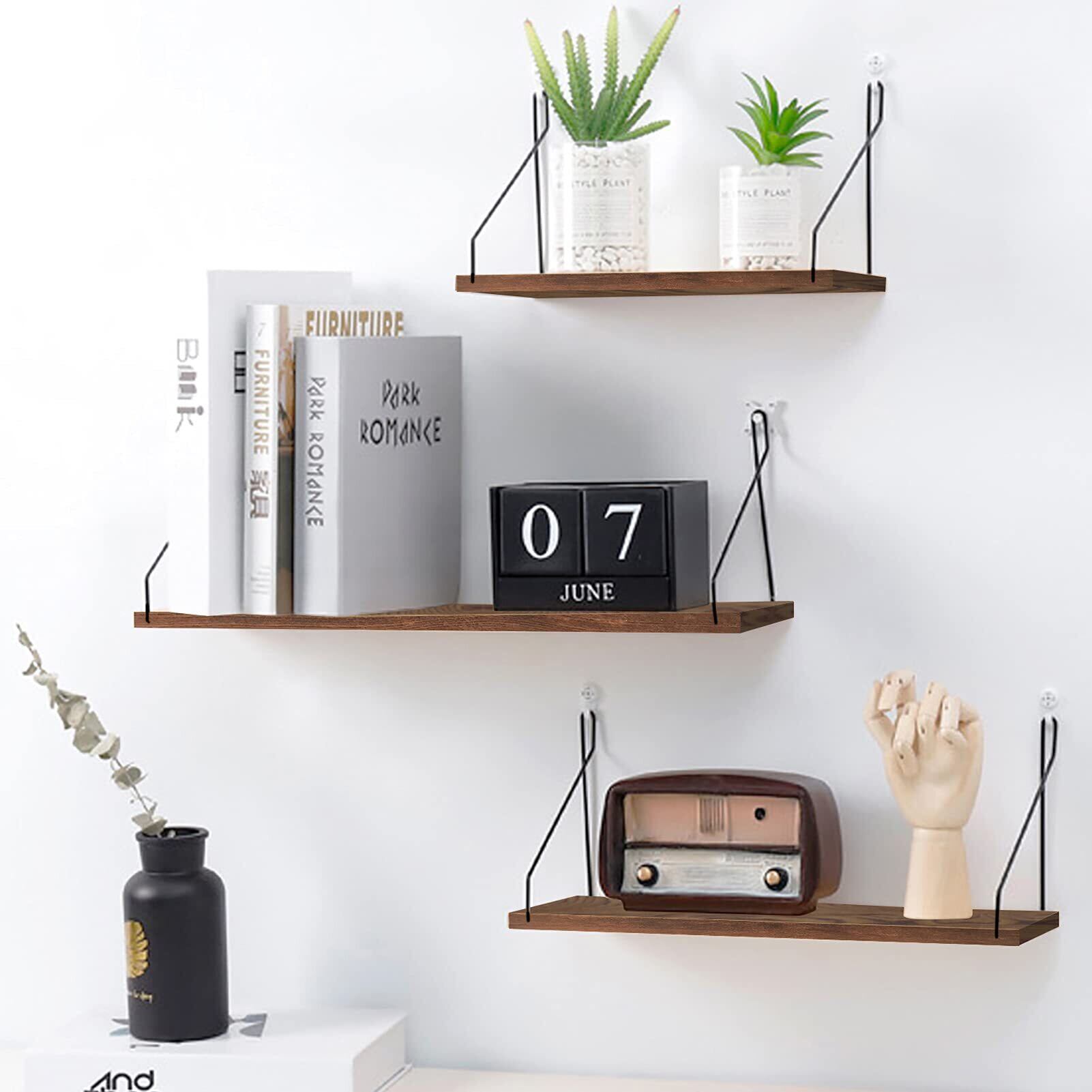 ウォールシェルフ 天然木 壁掛け棚 取付簡単 本棚 DIY 木製 飾り棚 シンプル ワイヤー付け 収納便利 (ブラウン, 30cm)