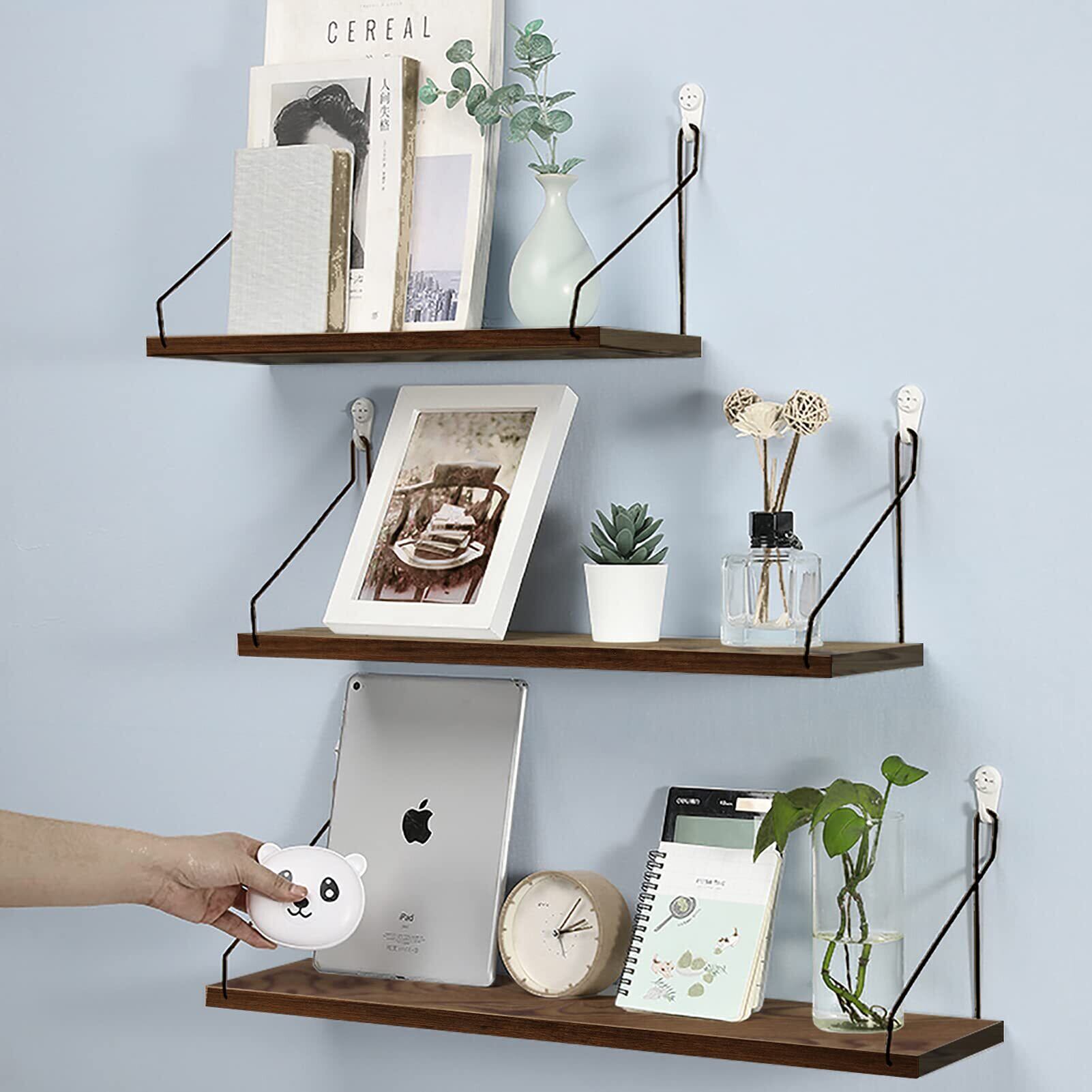 【数量限定】ウォールシェルフ 天然木 壁掛け棚 取付簡単 本棚 DIY 木製 飾り棚 シンプル ワイヤー付け 収納便利 (ブラウン, 30cm)