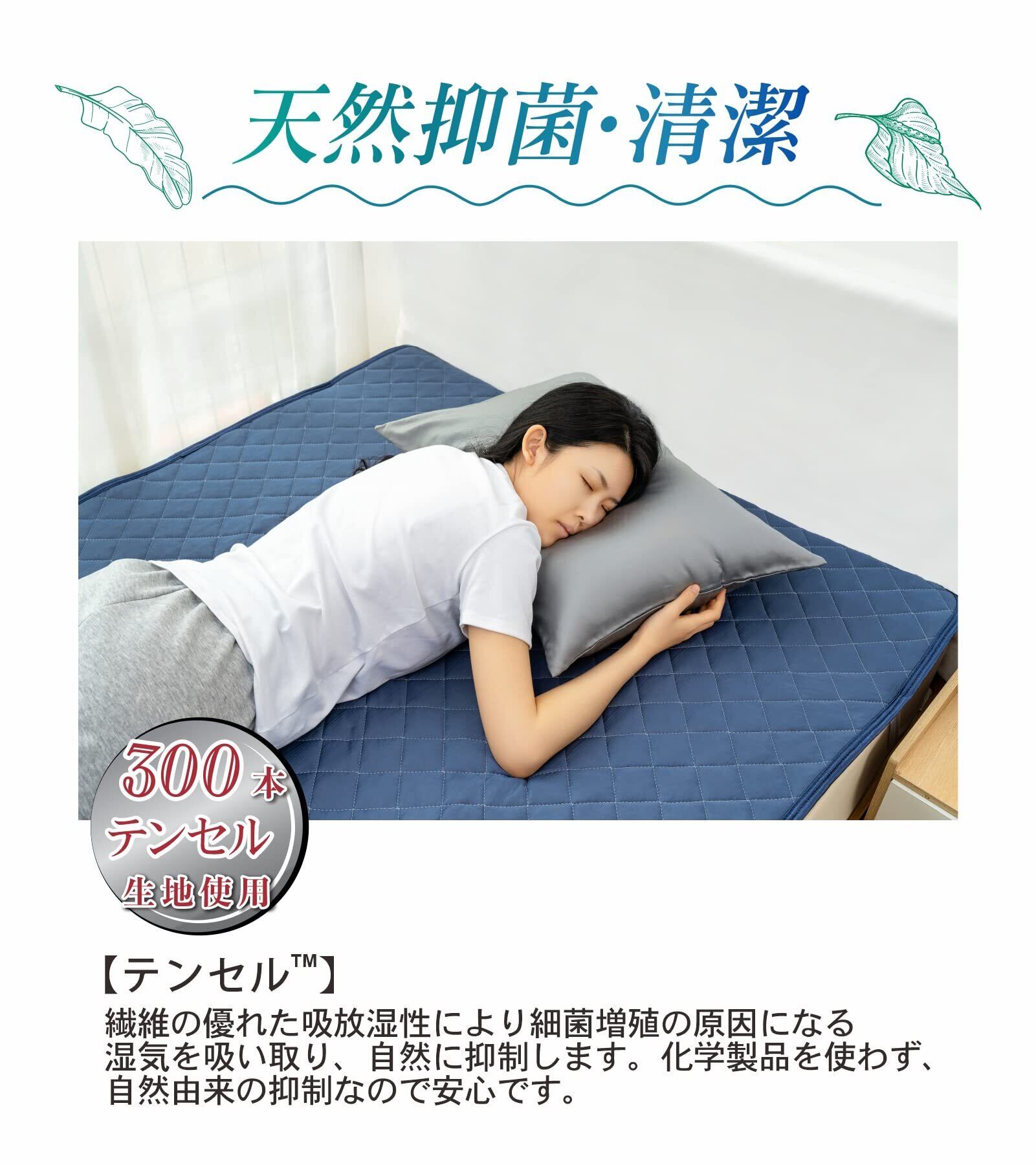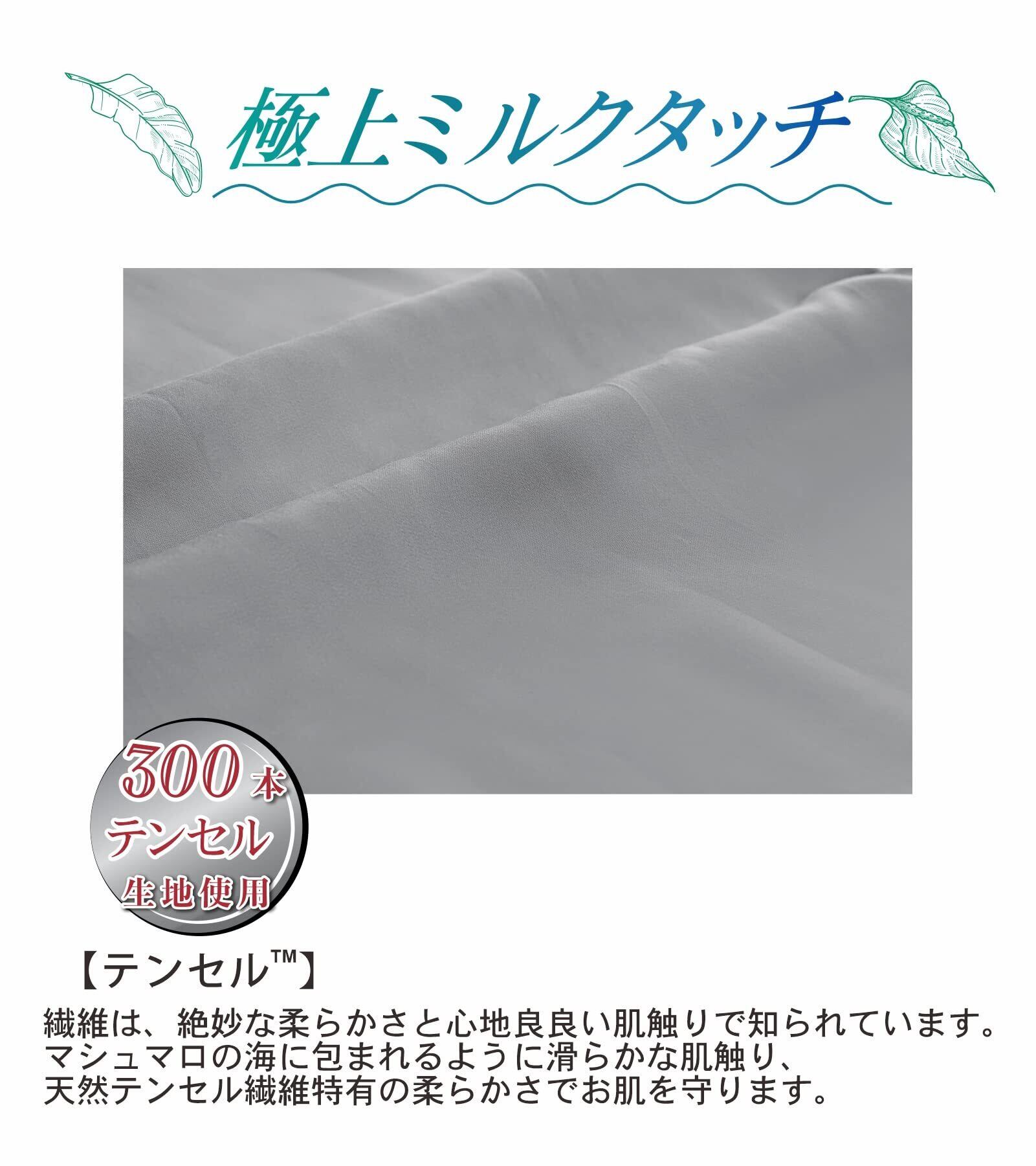 【接触涼感・丸洗い可能】テンセルは独特のフィプリル(極細の繊維)構造を持っているので、コットンよりも優れた温湿度制御性があり、いつもサラサラ。しっとりと柔らかい手触りを楽しめます。ハイクラス感の漂う光沢が、優雅な空間へと誘います。手洗いのみシルクと比較してもテンセルは洗濯機で使用便利。