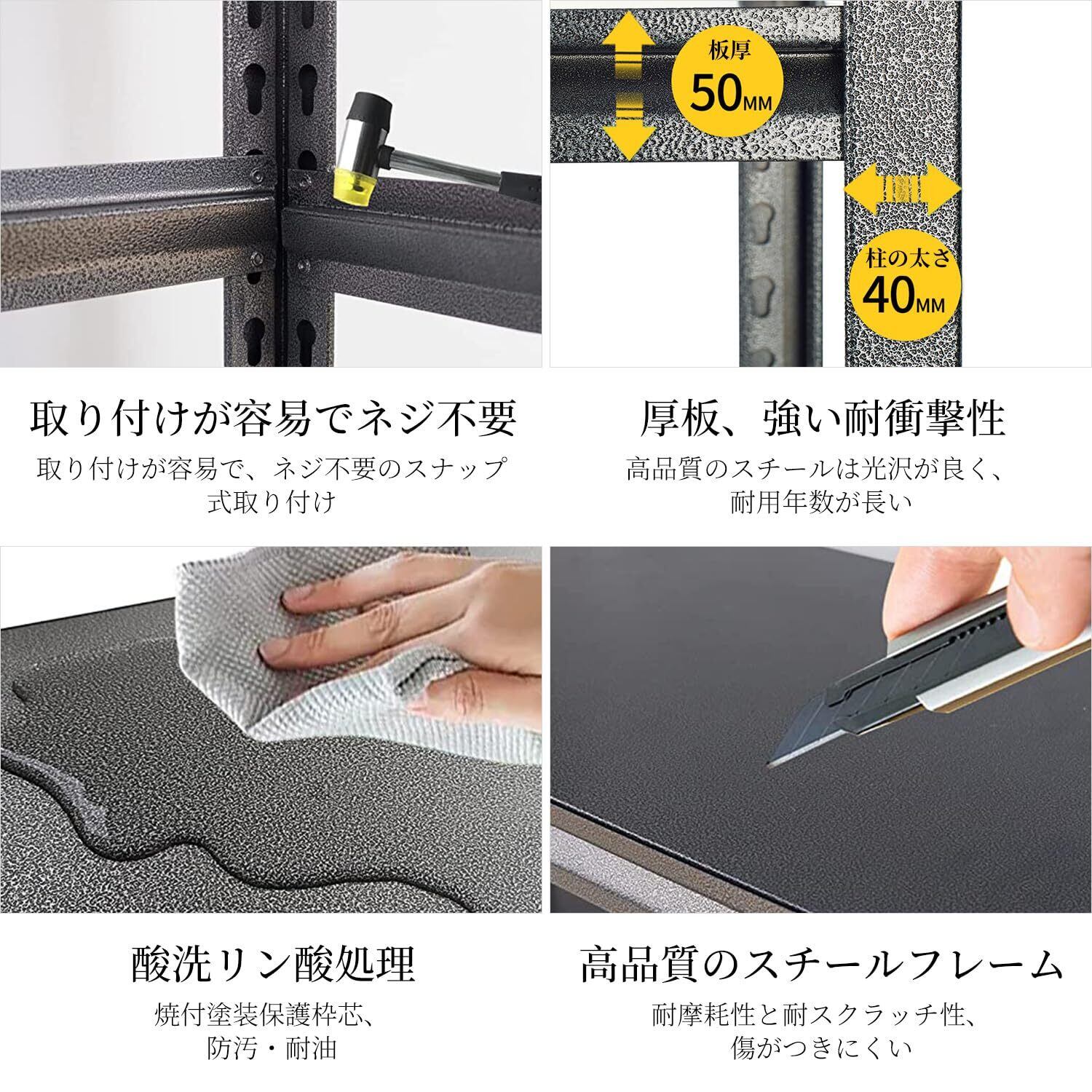 【組み立てが簡単】金属製収納ラックは、組み立てが簡単な特別な連動設計を採用しており、ゴムハンマーがパッケージに含まれており、特別な工具は必要なく、ナットやボルトなしで誰でも簡単に組み立てることができます