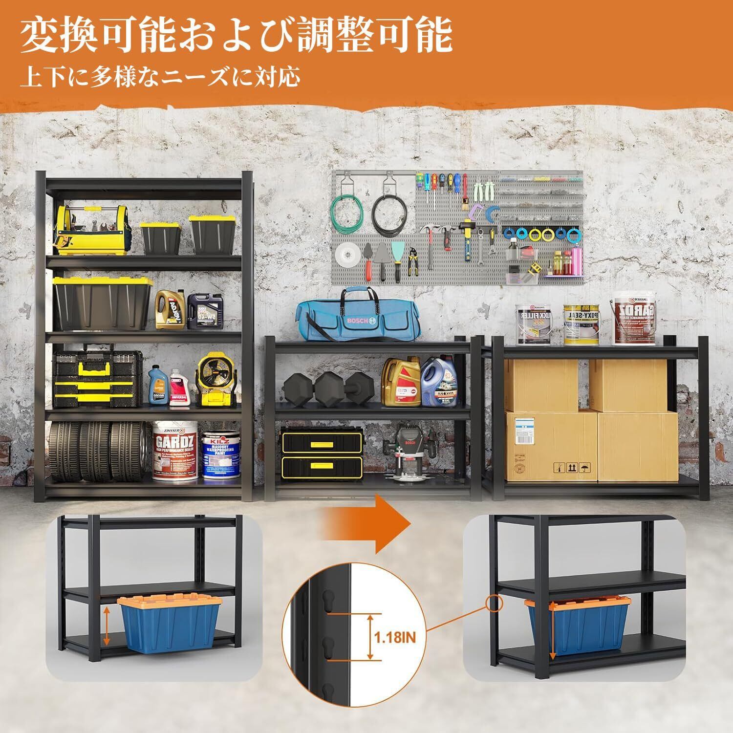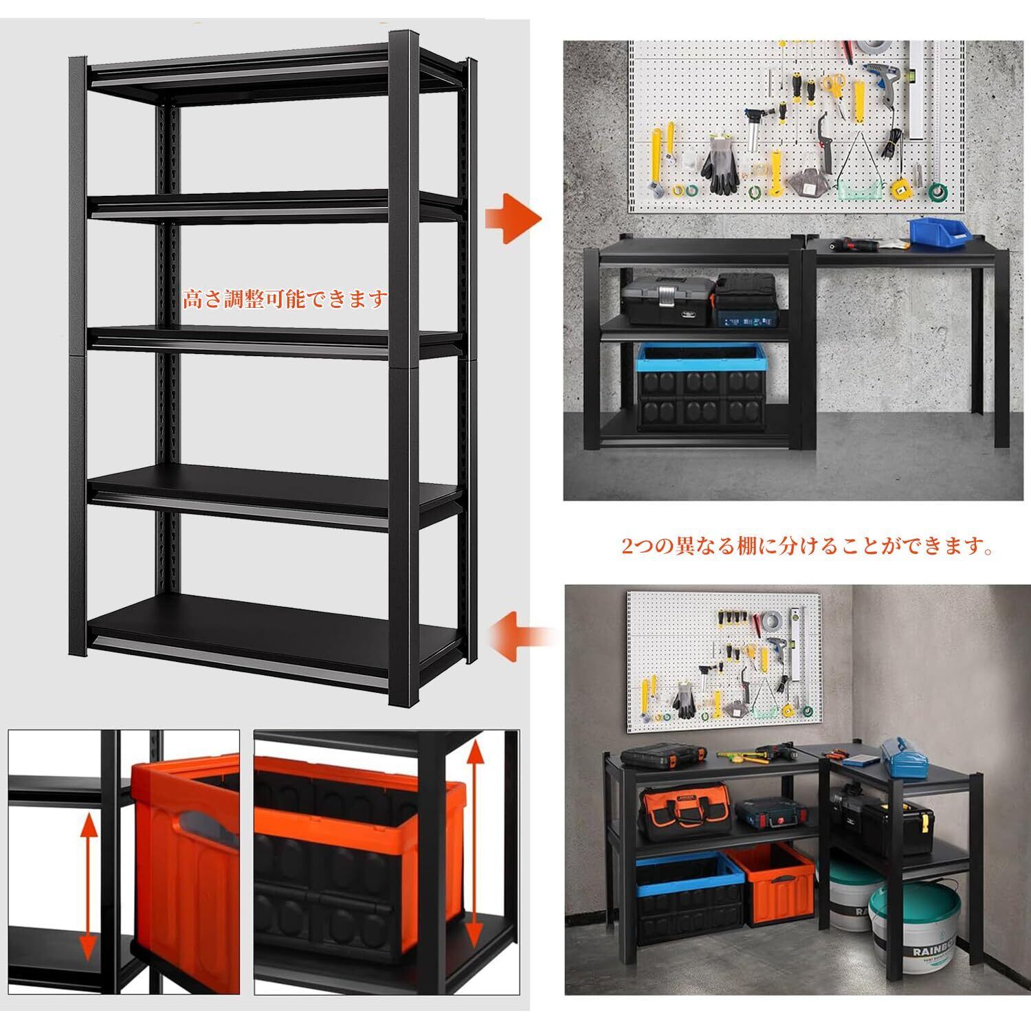 【調節可能な棚】この収納棚ユニットの各棚はさまざまな高さに調整でき、カスタマイズ可能な収納ソリューションを提供します(4段の棚は5段の棚のように取り外すことができず、他の棚は違いに問題がありません)。この機能は、ガレージや保管場所でさまざまなサイズのアイテムを整理するのに特に便利です