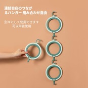 【使いやすい】リングの上のフックを、上のリングの下側にフックに引っ掛けるだけです。一番下に掛けたリングの下側のフックも使えます。輪っかのパーツは1個づつ別々の袋に入っており、それぞれの袋に1個、テープで壁などに貼れる粘着テープの付いたフックがついていました。こちらの商品と組み合わせなくてもこれ単独で使えます。