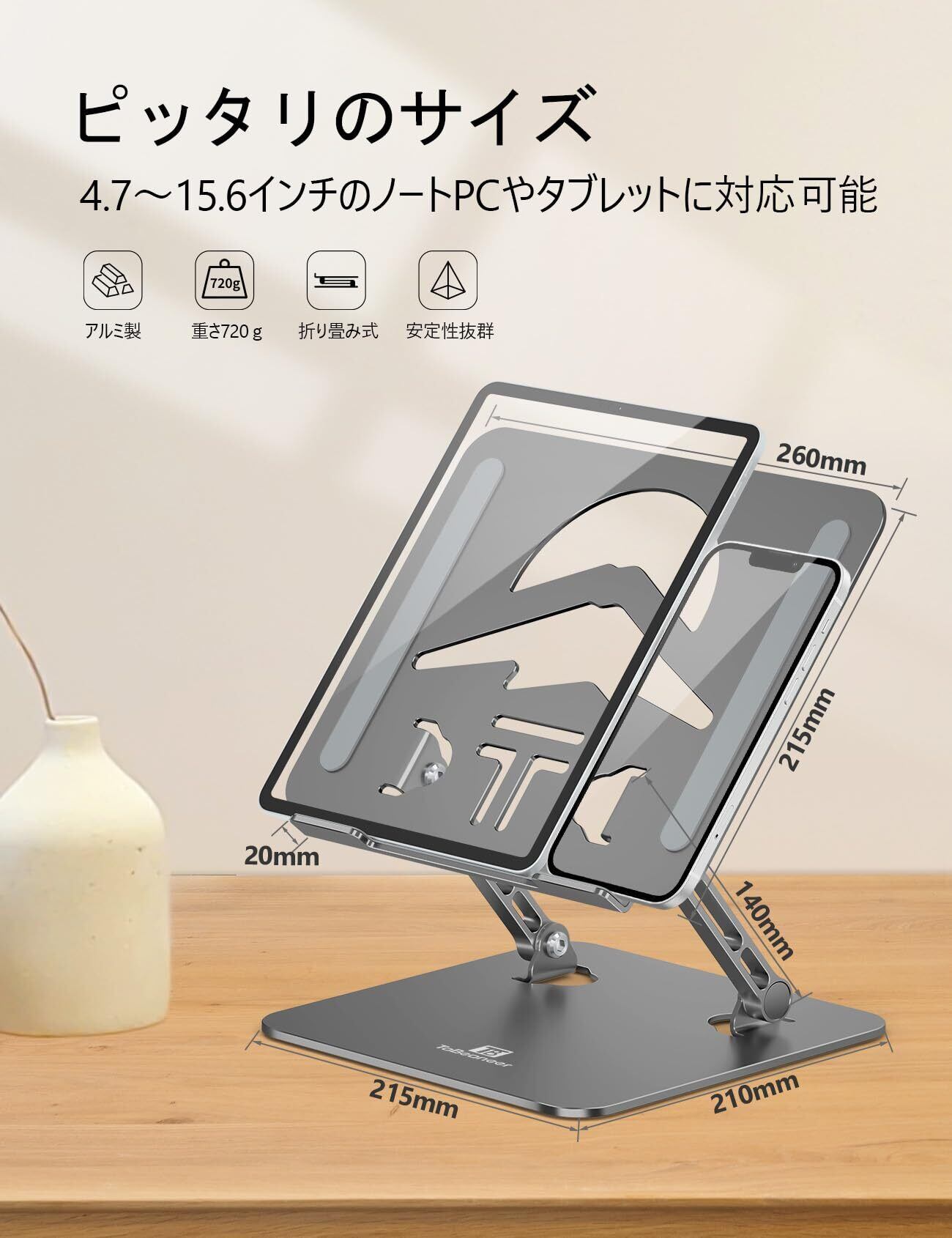 アルミ製のスタンドは軽量でありながらも非常に頑丈。最大15.6インチのノートPCやタブレットにも対応しており、安定した使用感を実現しています。表面は滑りにくく、安心してデバイスを置いておくことができます。