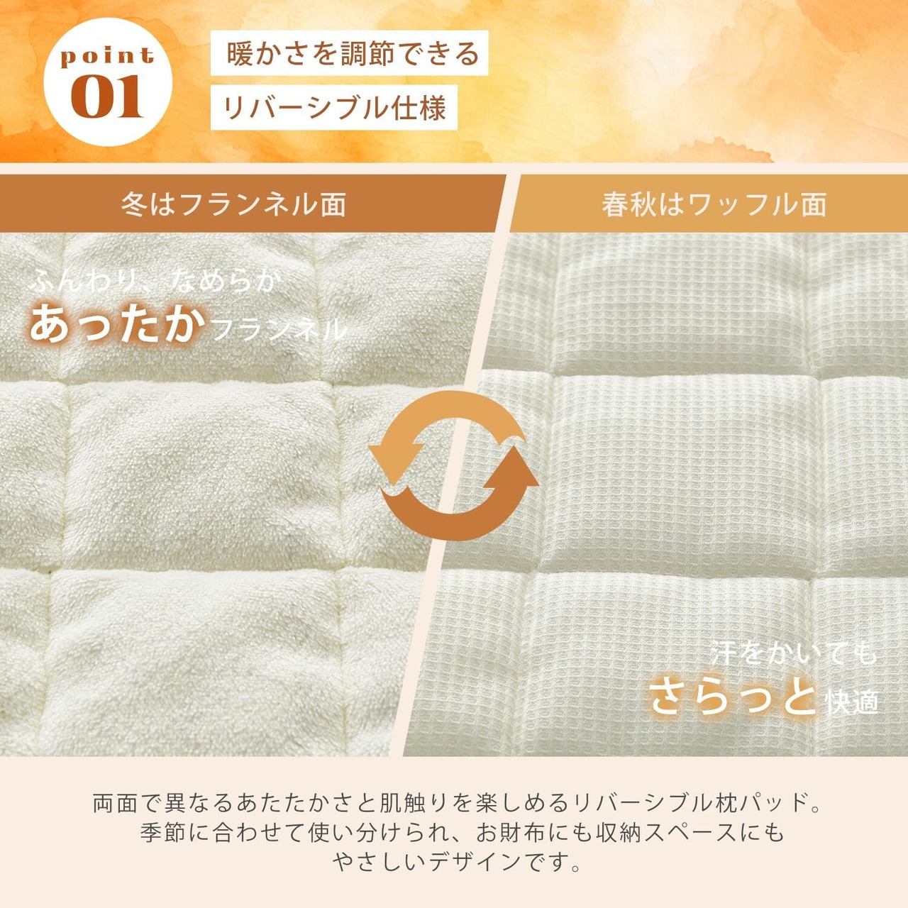 【在庫セール】Atokazo あったか 枕パッド 43X90cmリバーシブル 両面使える 秋冬用 冬用 オールシーズン 発熱 さらふわ かんたん着脱 肌に優しい ワッフル 洗える 吸湿速乾 中綿 ゴム ピローパッド まくらパッド 1枚単品 枕カバー アイボリー