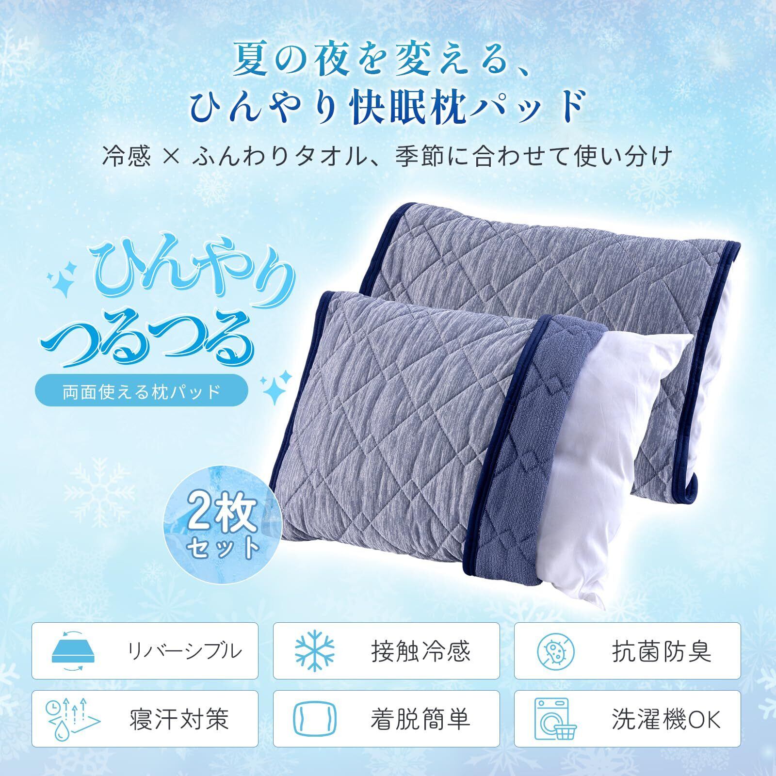 枕パッドの表側には冷感繊維素材を採用し、業界平均を大きく上回る Q - MAX 値 0.52 を実現しており、触れる瞬間に爽やかな冷感に包まれ、蒸し暑い夜も快適に過ごせます。両面使用可能で、夏は冷感面で暑さを凌ぎ、春・秋・冬は裏側の柔らかいタオル生地の面で心地よい眠りをサポートし、四季を通じて快適な睡眠体験を提供します。多層構造による強力な吸湿速乾性能により、寝汗を素早く吸収して蒸発させ、寝汗に起因する「あせもや肌荒れ」「頭皮のかゆみやニオイ」の発生を防ぎ、快適な睡眠環境を作り出します。また、抗菌防臭加工が施されており、細菌の繁殖を抑制し、不快な臭いを軽減して、ご家族全員の健康を守ります。洗濯機対応で、汚れや汗を簡単に落とせ、洗濯ネットを使用した単独洗浄を推奨して、使いやすさと衛生面を両立させています。2 枚セットの設計で、交換が便利で、汗ばむ季節の頻繁な洗い替えや、ご家族全員に配るのに最適です。更に、1 年間のメーカー付きで、日本企画による厳重な品質管理(中国工場は ISO9001 取得)のもとで生産されており、安心してお使いいただけます。