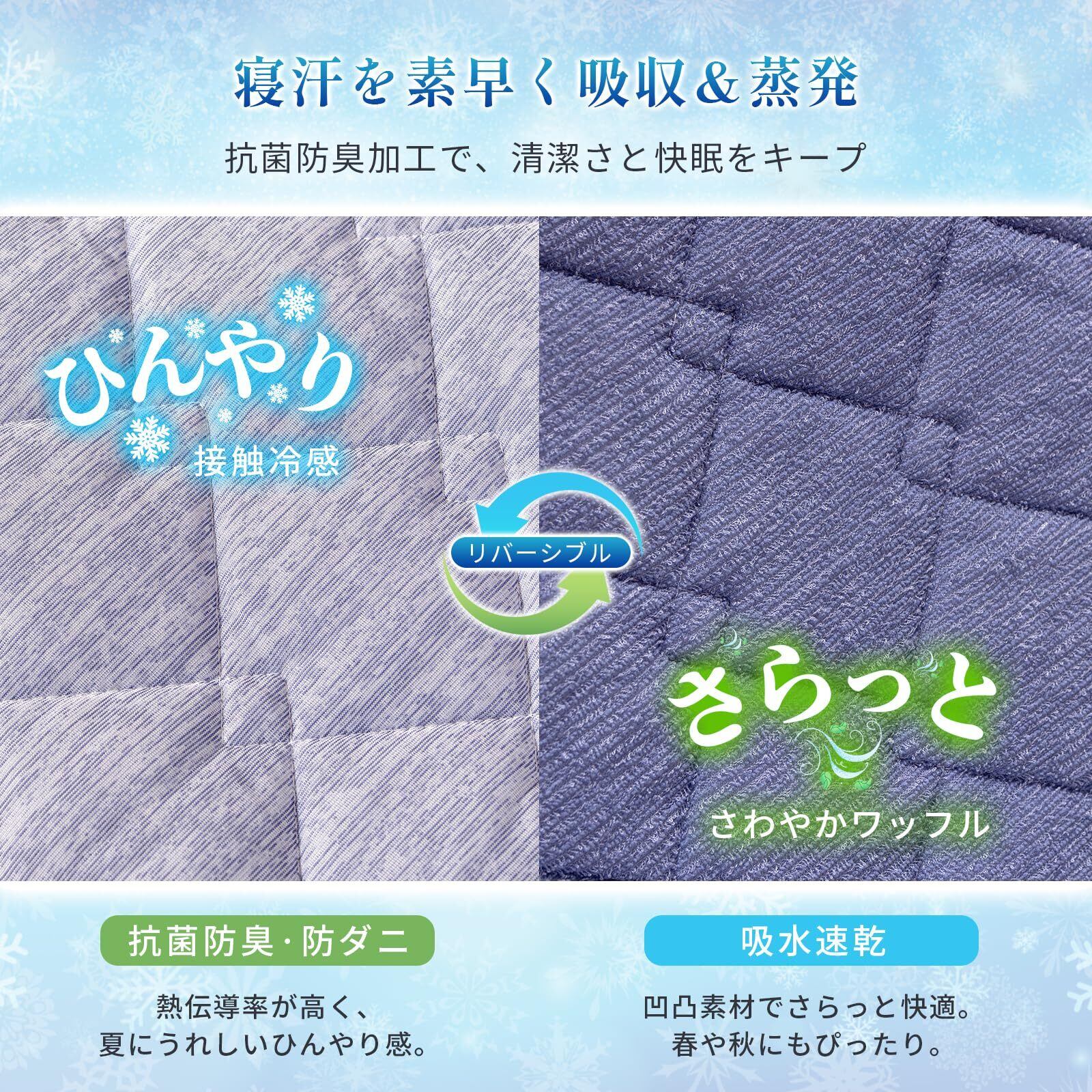 高性能なQ-MAX 0.52素材を採用しており、肌に触れると瞬時に冷感を感じられ、暑い夜も快適にお過ごしいただけます。リバーシブル仕様なので、気分や季節に合わせて異なる質感を楽しむことができます。