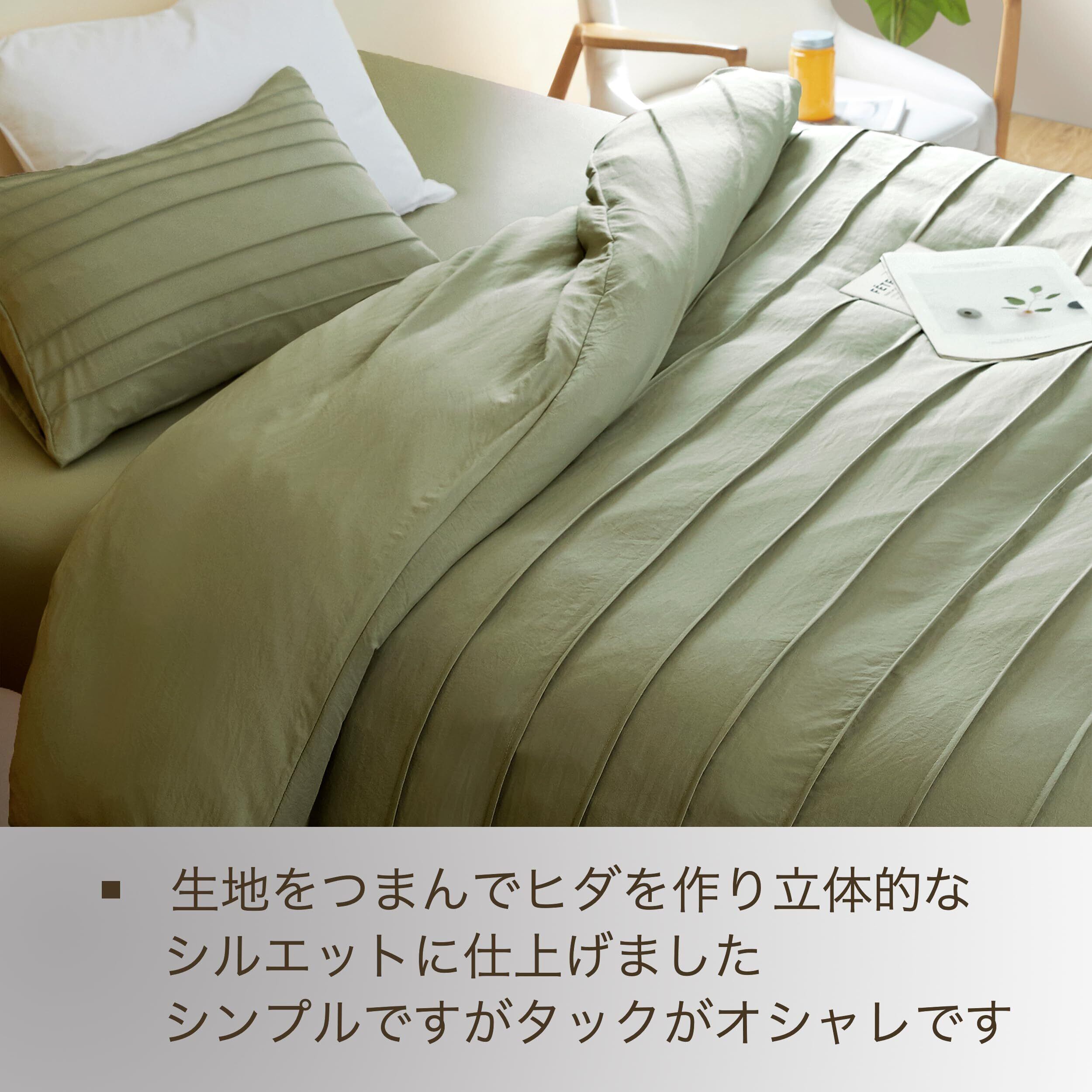 <シンプルなスタイル>:布団カバーは全体が無地で、枕カバーと掛布団カバーの表面は横にひだを作ったデザインです。洋式ベッドにも畳にもぴったりの布団カバーセットです。