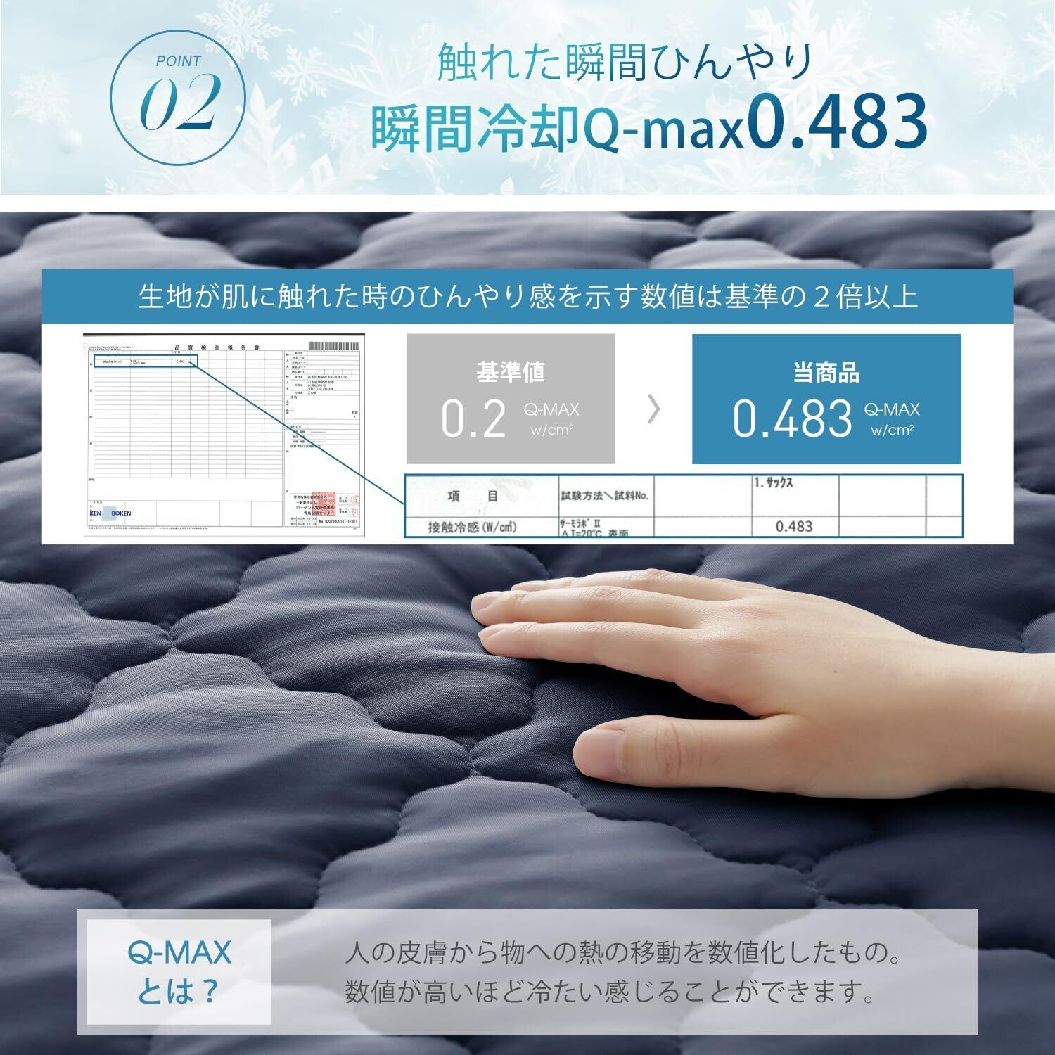 Q-MAX0.483の冷感素材を使用しており、肌に触れた瞬間にひんやりとした心地良さが広がります。夏の暑さや春秋の温度変化にもしっかり対応し、快適な睡眠環境をサポートします。