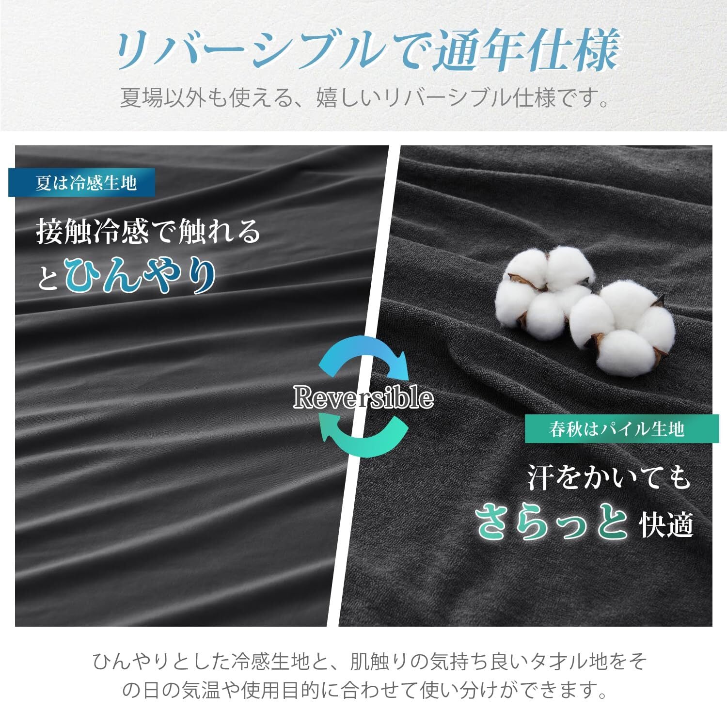【春~夏~秋まで長いシーズン使える】気温やシーンに合わせて、リバーシブルの冷感面とタオル面を使い分けられます。1枚で2通りの使い方ができるので、理想の眠りを実現!