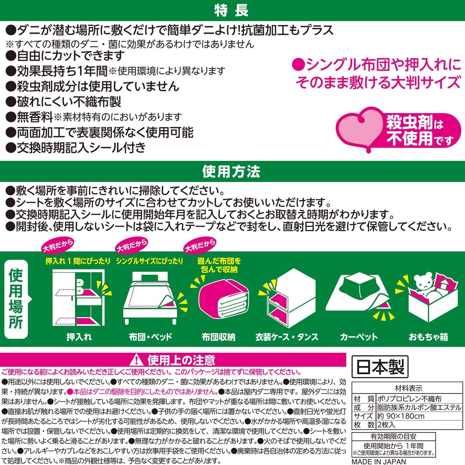 (使用場所)…押入れ/布団・ベットパッドの下/衣装ケース・タンス/カーペット・ラグ/おもちゃ箱/枕の下 など ダニを寄せつけたくない場所に敷いて使用します。