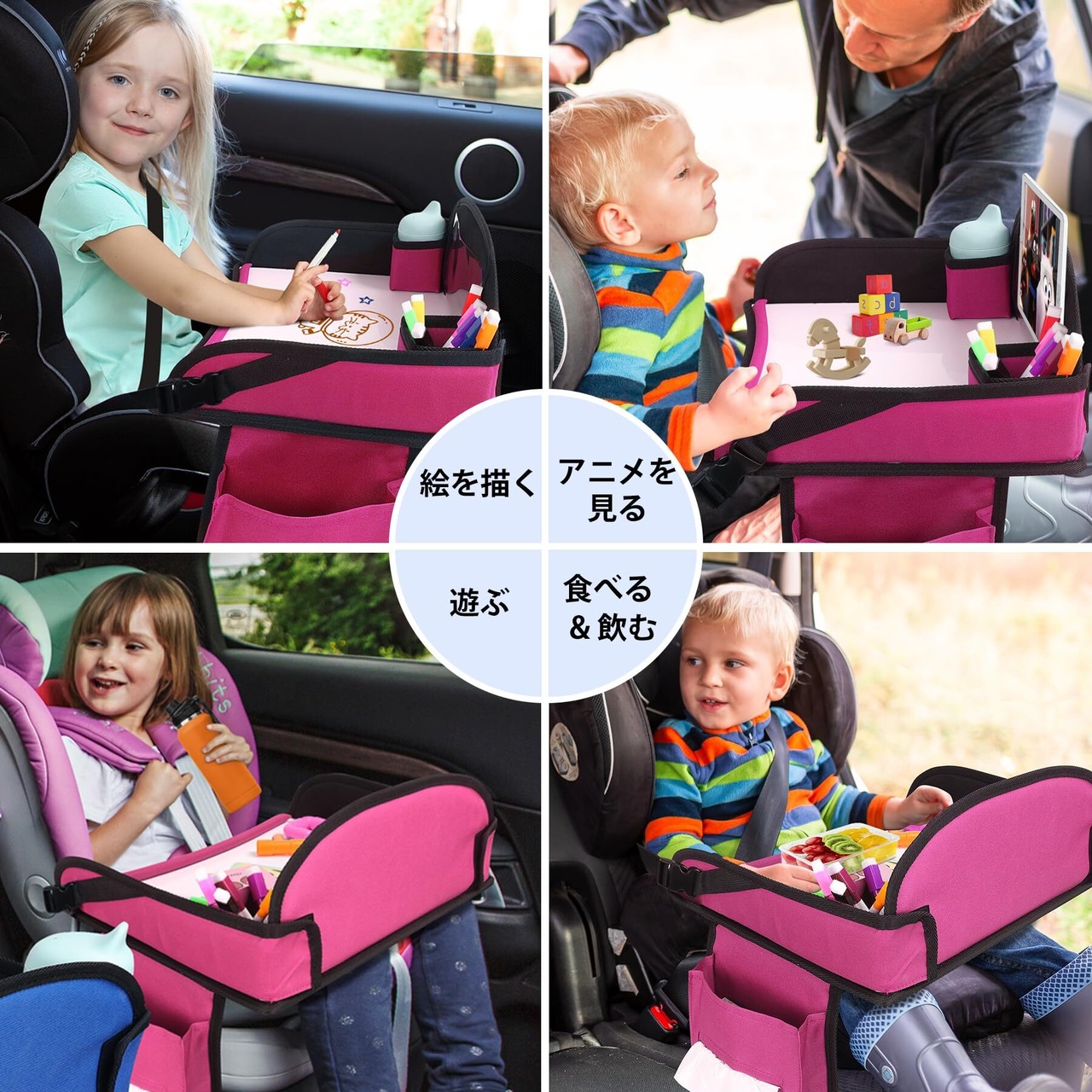 【チャイルドトレイテーブル】長距離の外出時に、お子様はこのトレイテーブルを使って、お絵かきをしたり、おもちゃで遊んだり、タブレットを見たり、食事をしたりすることができます。車内での時間を楽しく過ごすことができる、とても便利なアイテムです。