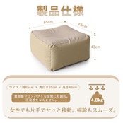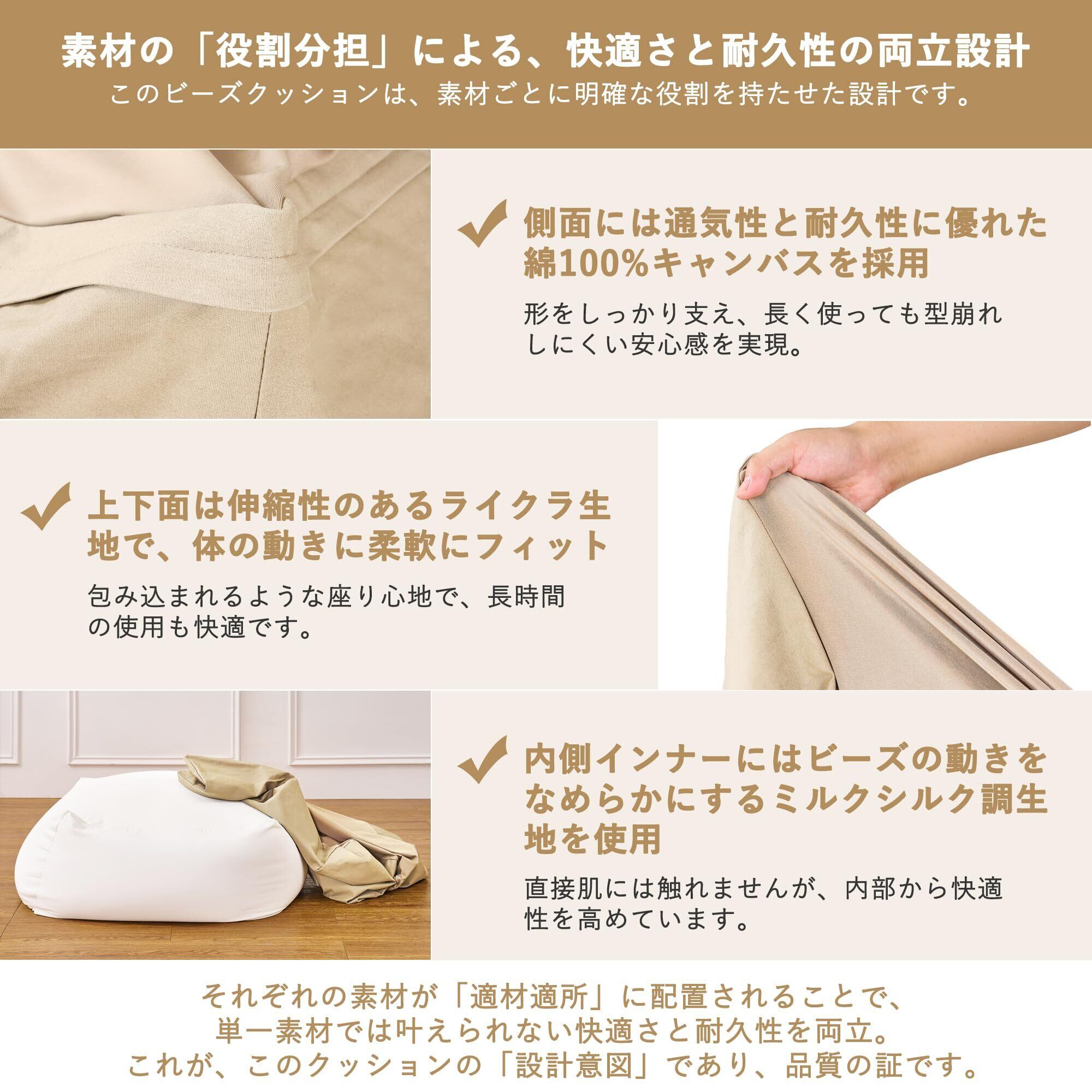 【製品仕様】:サイズ:約65×65×43㎝/【重量】:4.8kg/【カラー】:アイボリー/【填充物】:0.5mm EPS微粒/【内袋生地】:ミルクシルク生地(95%ポリエステル+5%スパンデックス)/【外カバー】:<側面素材>:しっかりとした厚手の綿帆布(100%コットン) <側面素材>:高弾性ストレッチ素材(ポリエステル90%+ポリウレタン10%)