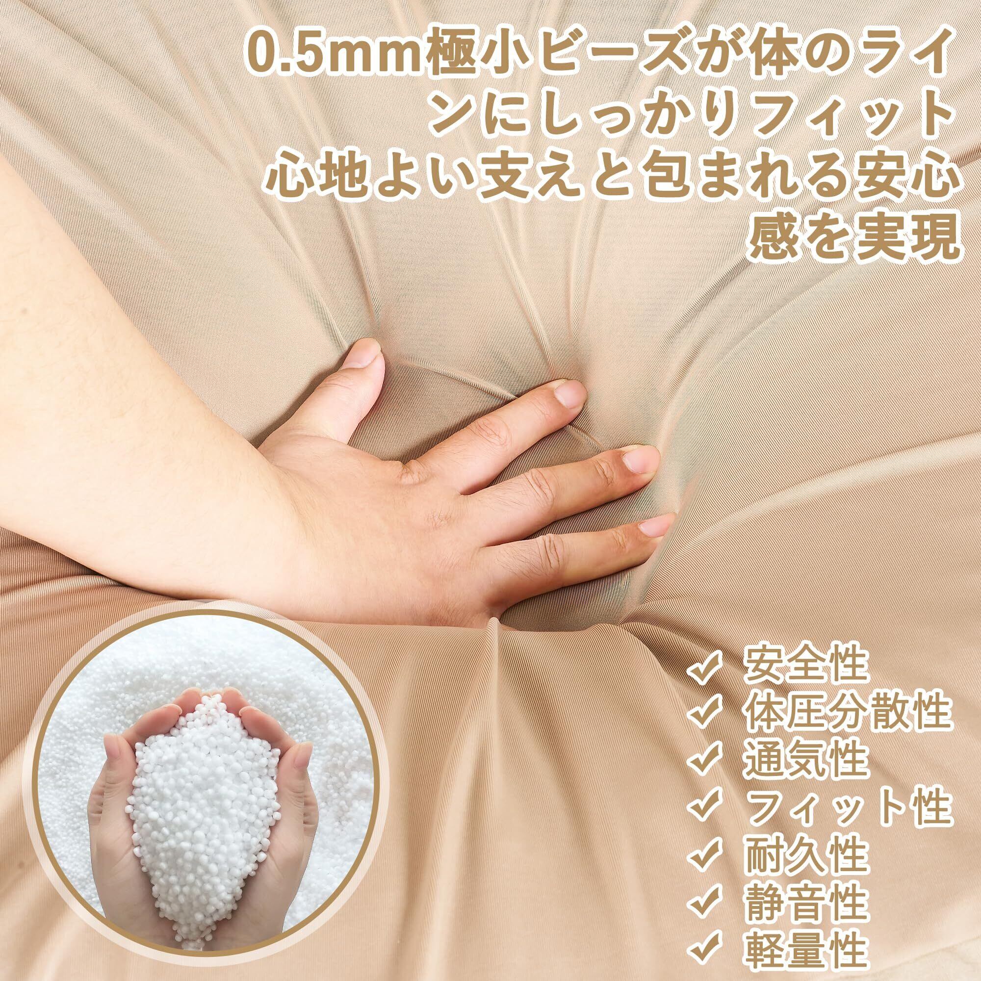 【0.5mm EPSビーズ充填】 直径0.5mmの極小ビーズが座るたびに体にやさしくフィットし、自然な姿勢をサポート。軽量なのにしっかり体を支えるので、長時間座っても快適。女性でもラクに持ち運べる軽さに加え、防カビ加工で湿気の多い季節も安心です。