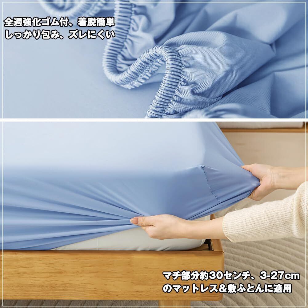 「360度ゴムバンド設計 厚いマットレスも完全フィット」伸縮性抜群、最大27cm厚のマットレスにもピタッと密着(サイズ調整可能)。伸縮率200%を実現しながら型崩れゼロ。全週ズレ防止ゴムバンド付きで、寝返りをしてもズレないです。
