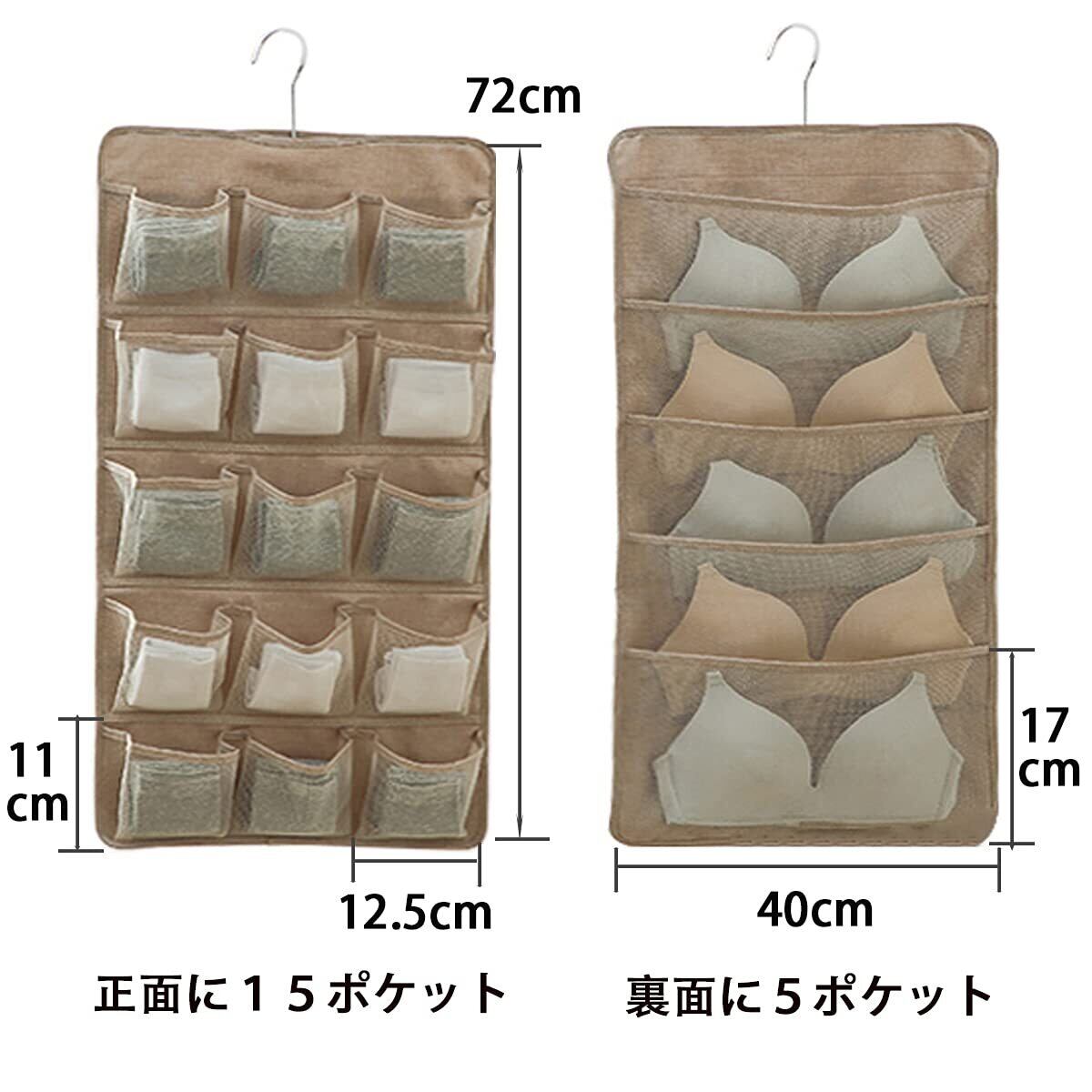 2.【大容量サイズ】80*40センチの両面サイド収納ポケットは正面が15個のポケットがあり、反面が5個があり、合計20個のポケットが利用可能!ランジェリーをいっぱいもっているおうちなら、クローゼットに吊り下げる収納も便利です。引き出しに入り切らなくても外に大容量の収納を確保できますよ。