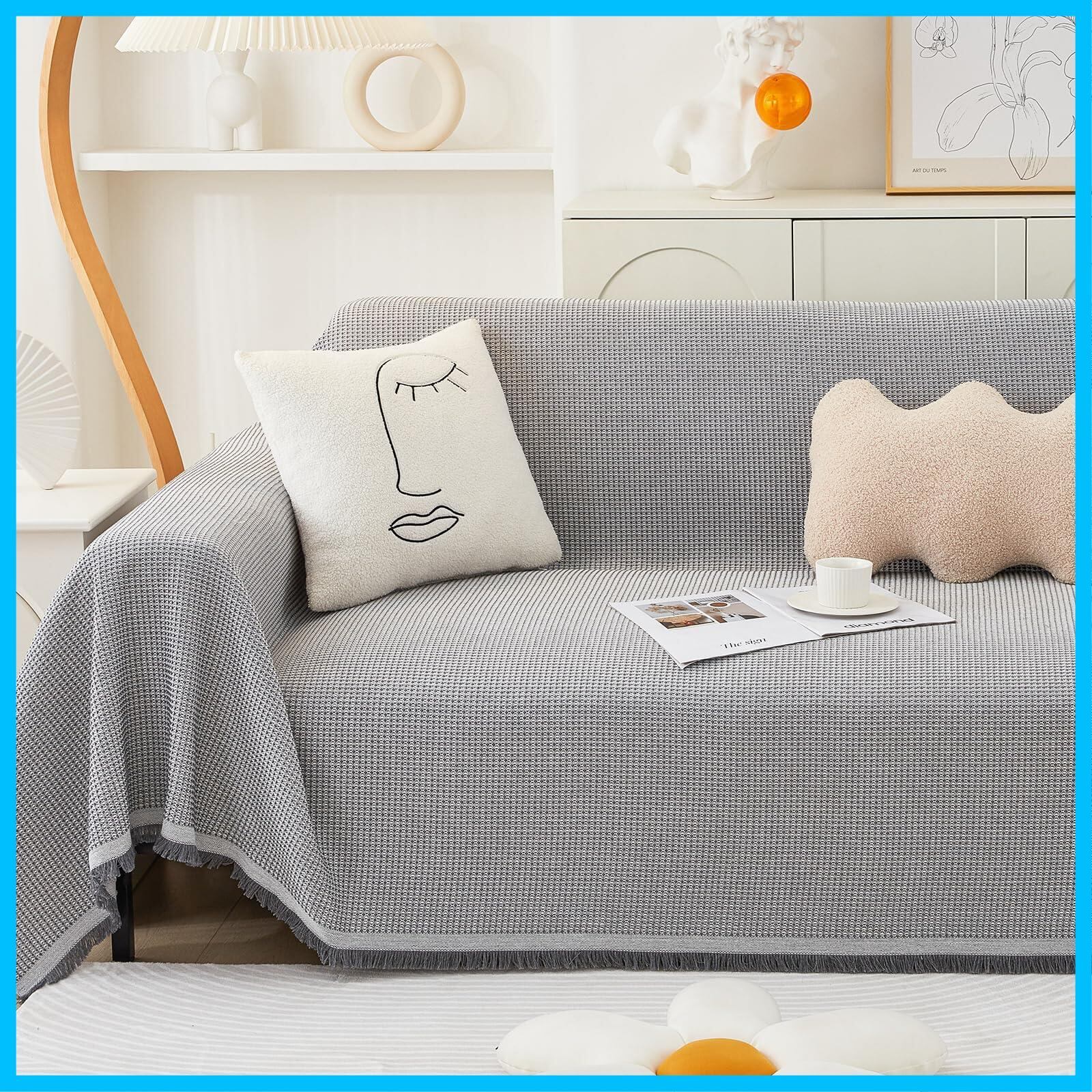 【特価セール】JEMAジェマ ソファーカバー 北欧風 マルチカバー テーブルクロス ソファカバー ベッドカバー 長方形 ブランケット 綿混 リバーシブル 毛布 無地 保護カバー 防塵 キズ防止 汚れ防止 洗える 四季通用 グレーホワイト・ワッフル柄 230×180cm(2人掛け)