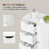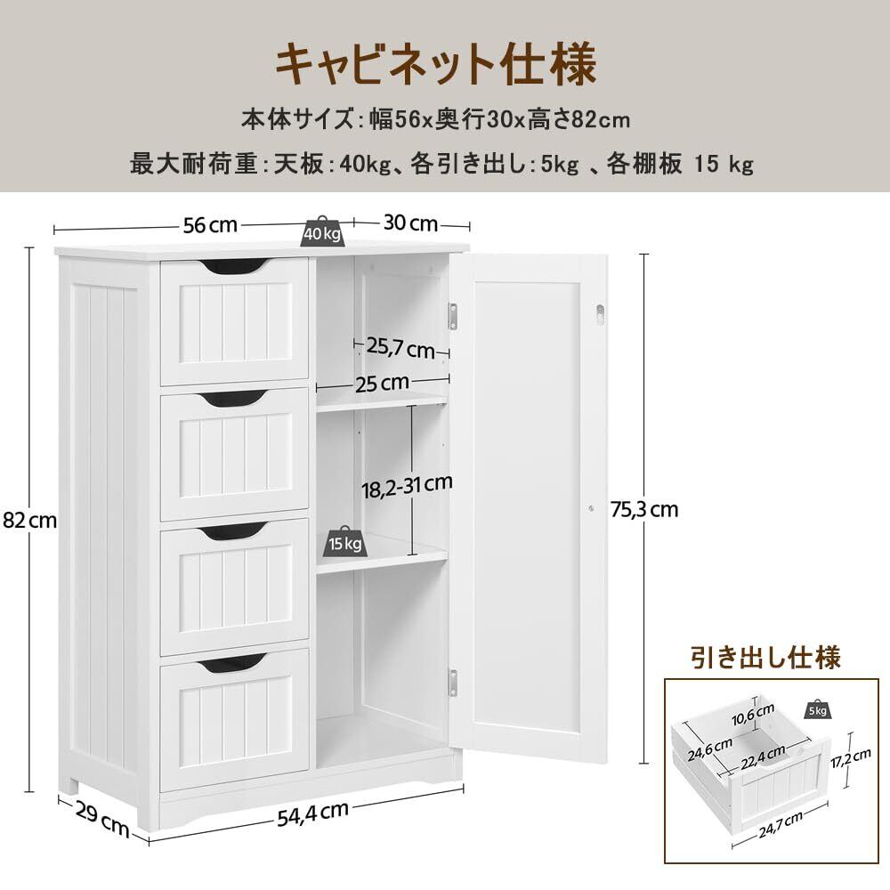 【商品仕様】:商品サイズ:幅56x奥行30x高さ82cm、素材:MDFボード、調節可能な棚板間の距離:18.2cm‐24.6cm‐31cm、 商品重量:15.35Kg、最大耐荷重:天板:40kg、各引き出し:5kg 、各棚板 15 kg