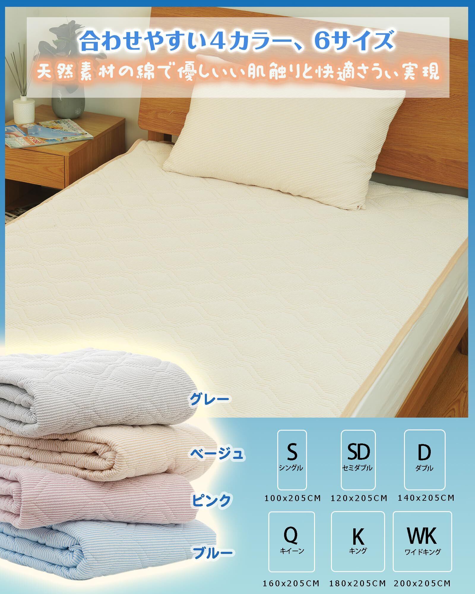【さらさら綿敷きパッド 】柔らかなニットサッカー素材を贅沢に使用し、最新の技術で織り上げた夏用 敷きパッド。その心地よい触感はまさに至福のひとときを約束します。内部には抗菌性に優れた帝人中綿を厳選し、清潔で健康的な睡眠環境を提供いたます。柔らかい手触りと優れた通気性を持ち、身体を快適な温度に保ちます。リラックスした眠りを追求する方にぴったりの選択です。