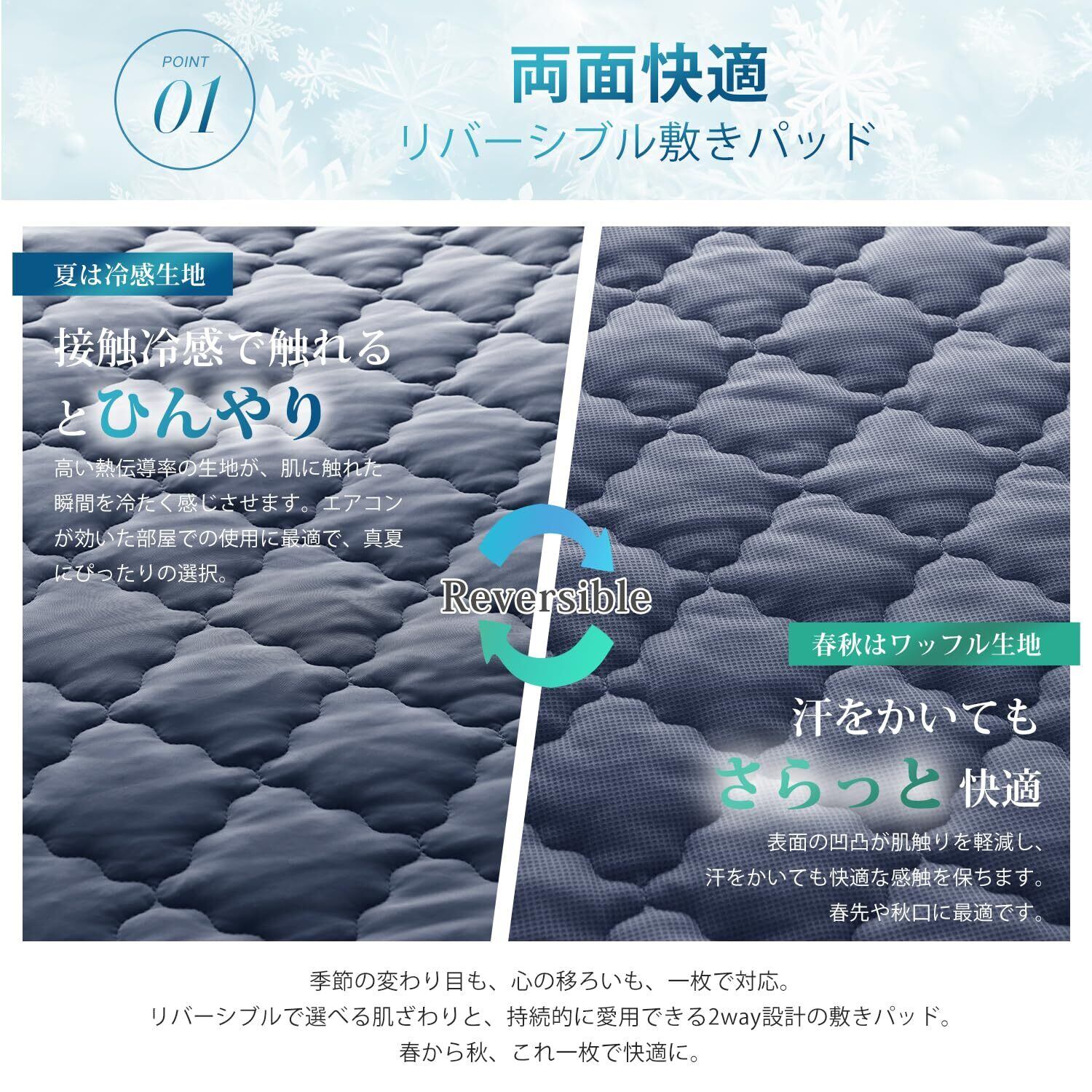 この敷きパッドはリバーシブル仕様で、裏面と表面のデザインを使い分けることで、飽きずにお使いいただけます。夏はひんやり、春秋は優しい肌触りを楽しめ、オールシーズンに適した一枚です。