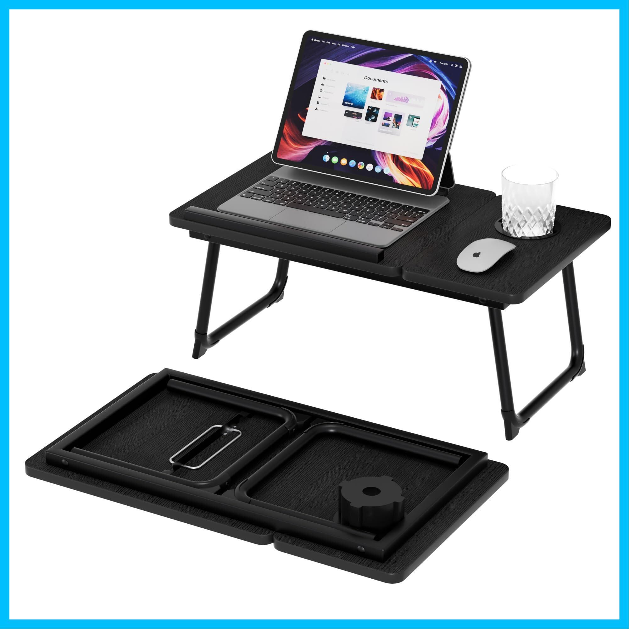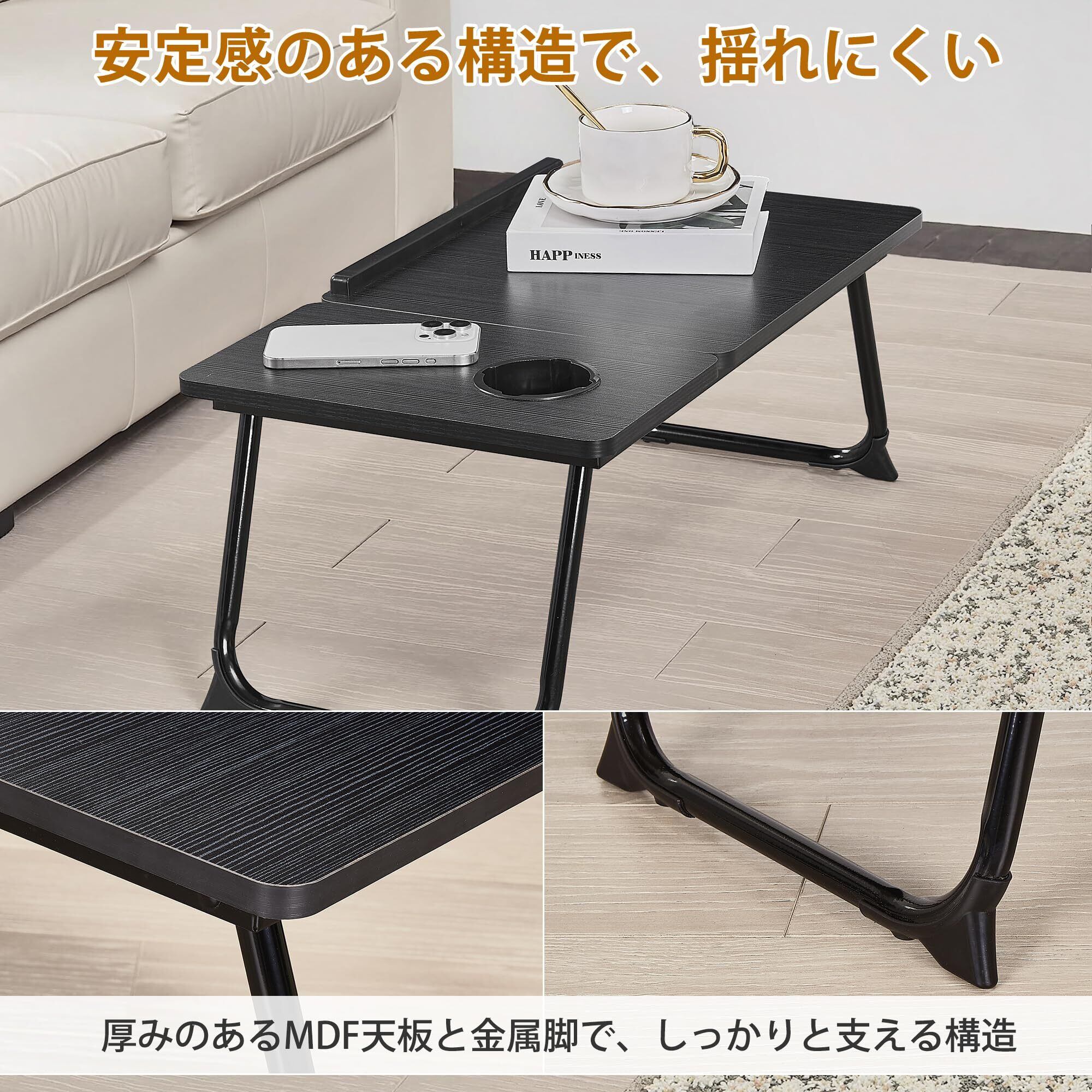 【在庫セール】VECELO オリタタミテーブル 幅55cm × 奥行き32cm × 高さ25cm 高さ5段階調整 2.55kg 耐荷重45kg 片側リフトアップ式 安定感強化 12mm厚天板+PVC縁加工 滑り止めストッパー搭載 ドリンクホルダー付き マウススペース付き パソコンデスク ベッド ローテーブル 多機能 省スペース コンパクト 完成品 ブラック【日本正規輸入品】