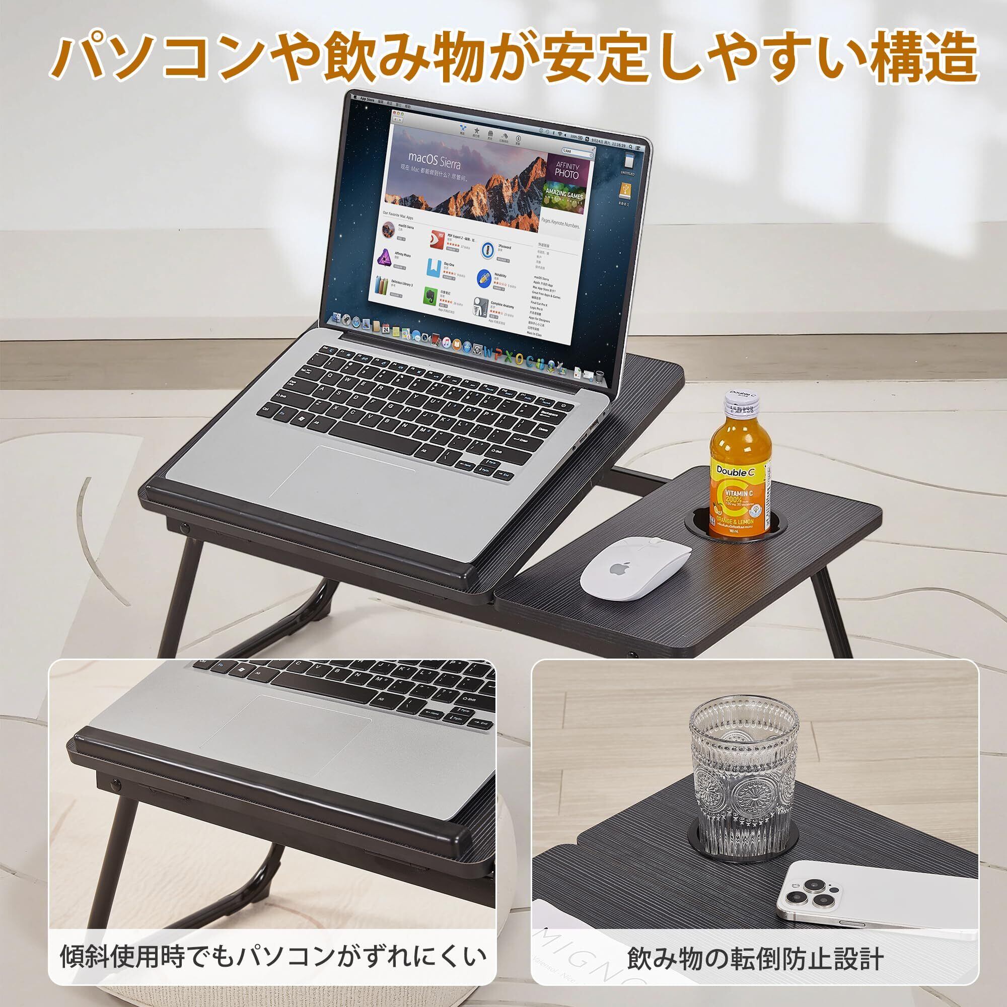 【滑り止めストッパー付きで安心設計】:天板には滑り止めストッパーを搭載し、傾けた際にもノートパソコンやタブレットがずれ落ちにくい安心設計。ドリンクホルダーとマウススペースも備え、快適な作業環境をサポートします。