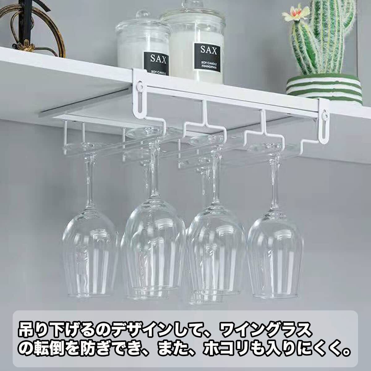 『ホコリを入りにくい』吊り下げるのデザインして、吊り戸棚の棚板に差し込んで、ワイングラスが、逆さに収納で,洗った後にそのまま掛けて乾かしても大丈夫。ほこりも入りにくい、水はけもよくきれいに乾くこと。