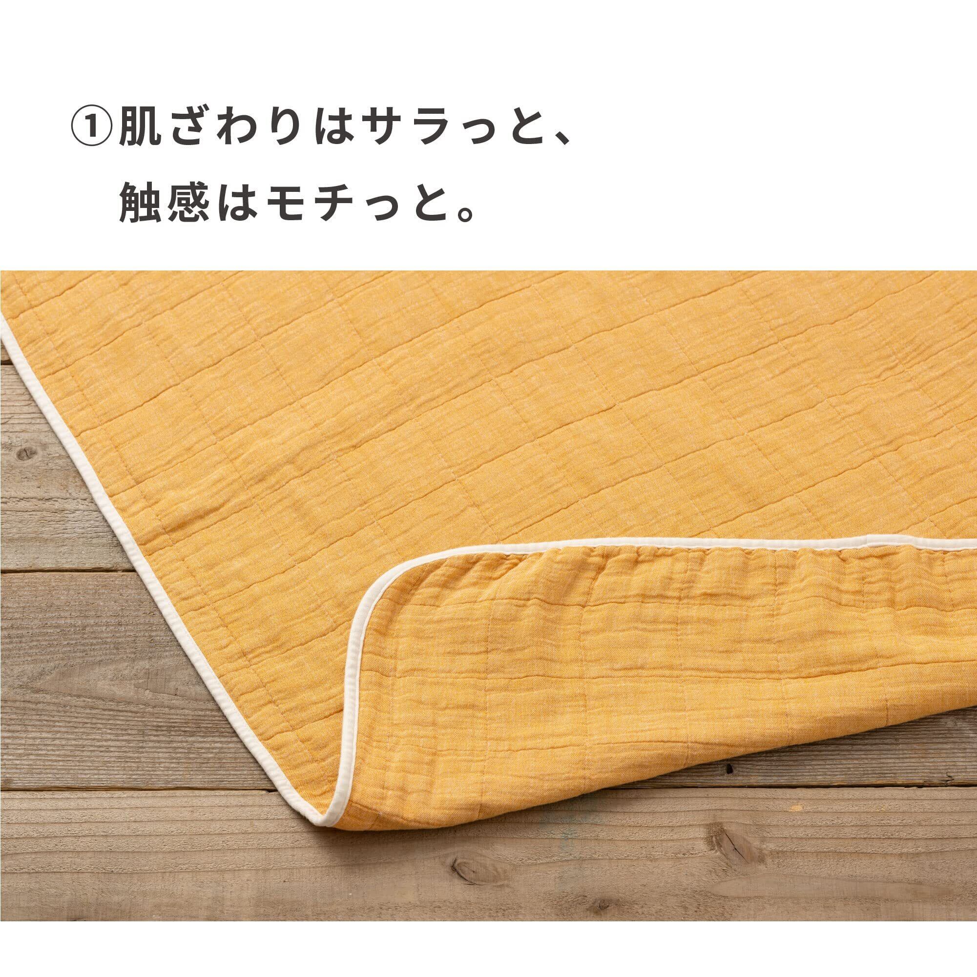 4重織の構造により、軽やかでふんわりとした感触が特長です。肌に優しく、家族みんなで安心してご使用いただける素材感が魅力的です。快適な寝具としてはもちろん、リビングでのくつろぎタイムにも最適です。
