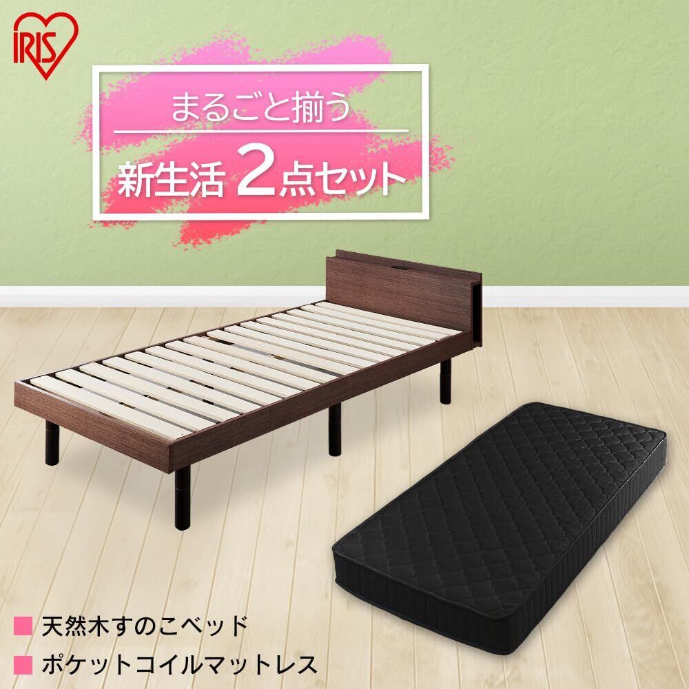 【特価セール】アイリスプラザ 【新生活2点セット】ベッド ベッドフレーム 棚付き 2口コンセント ブックシェルフ付 3段階 シングル+高密度ポケットコイルマットレス 身体の負担を軽減 独立コイル528個 極厚20cm シングル ブラック