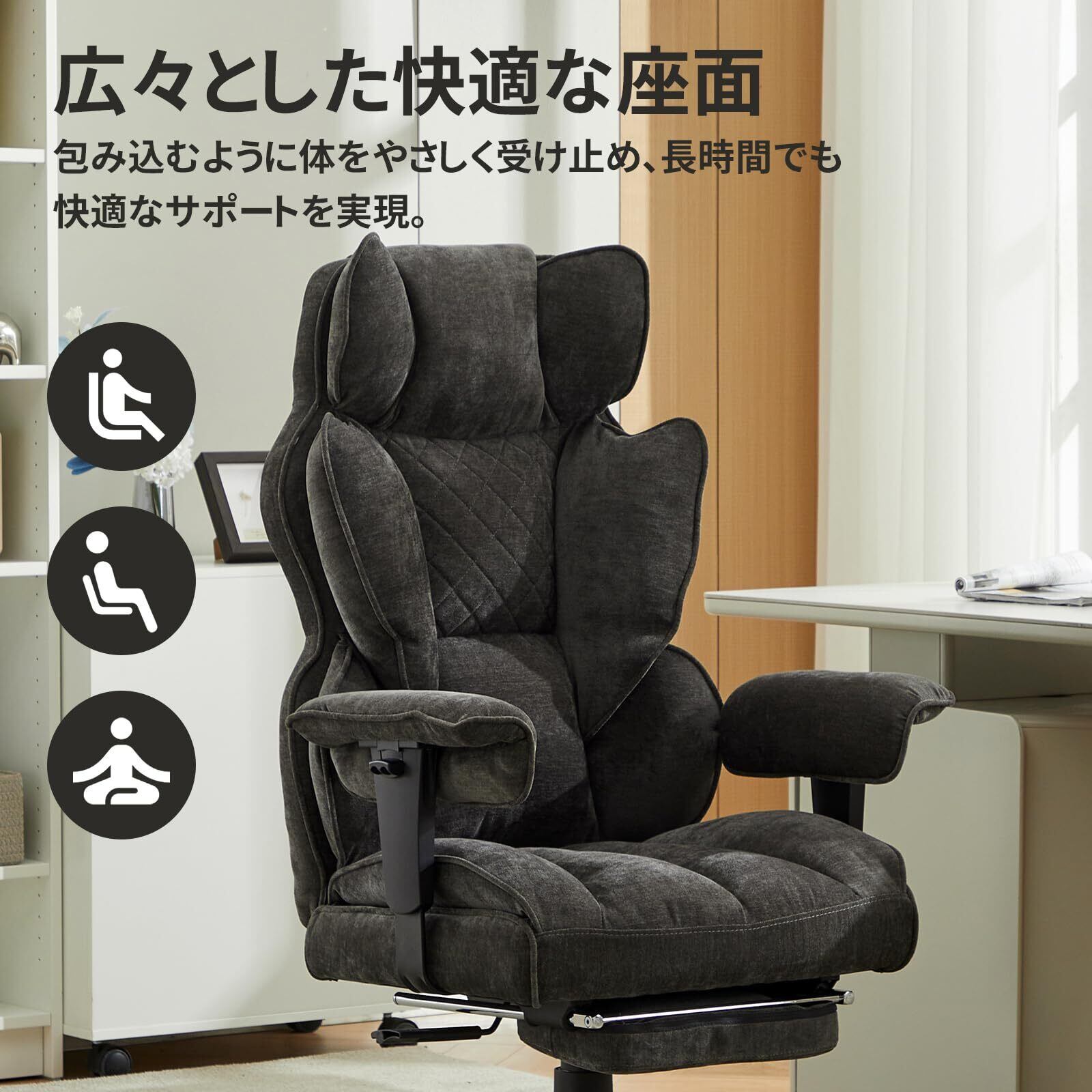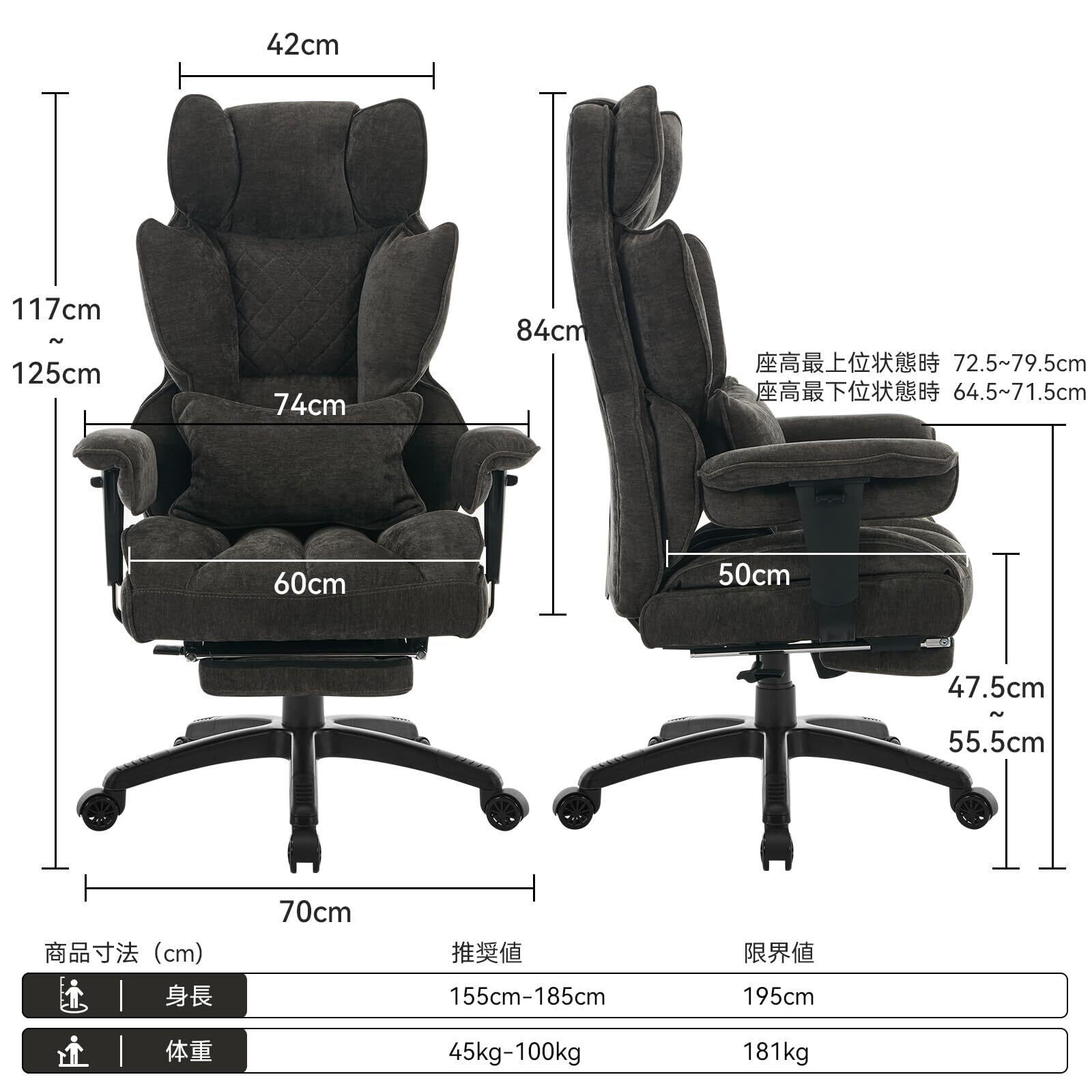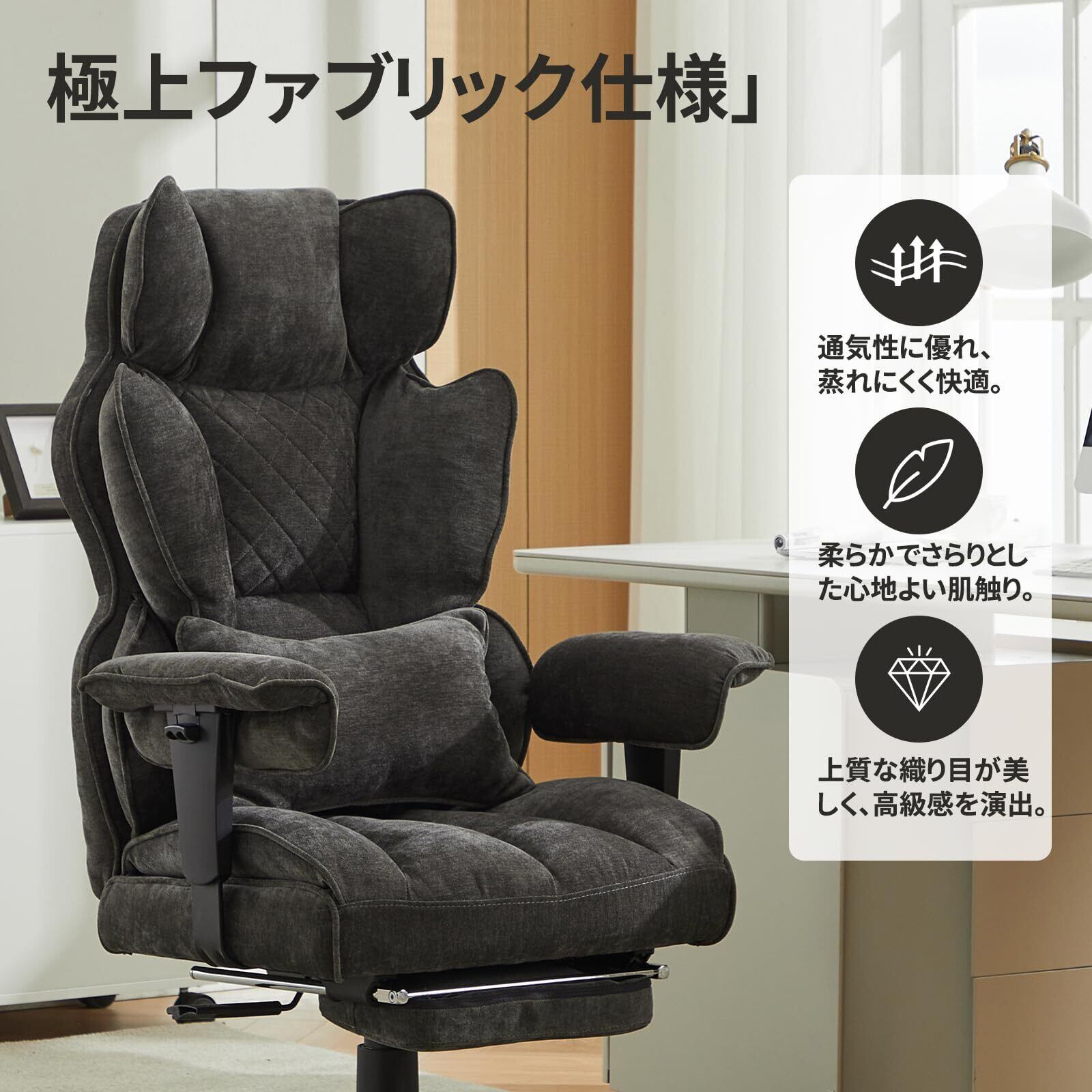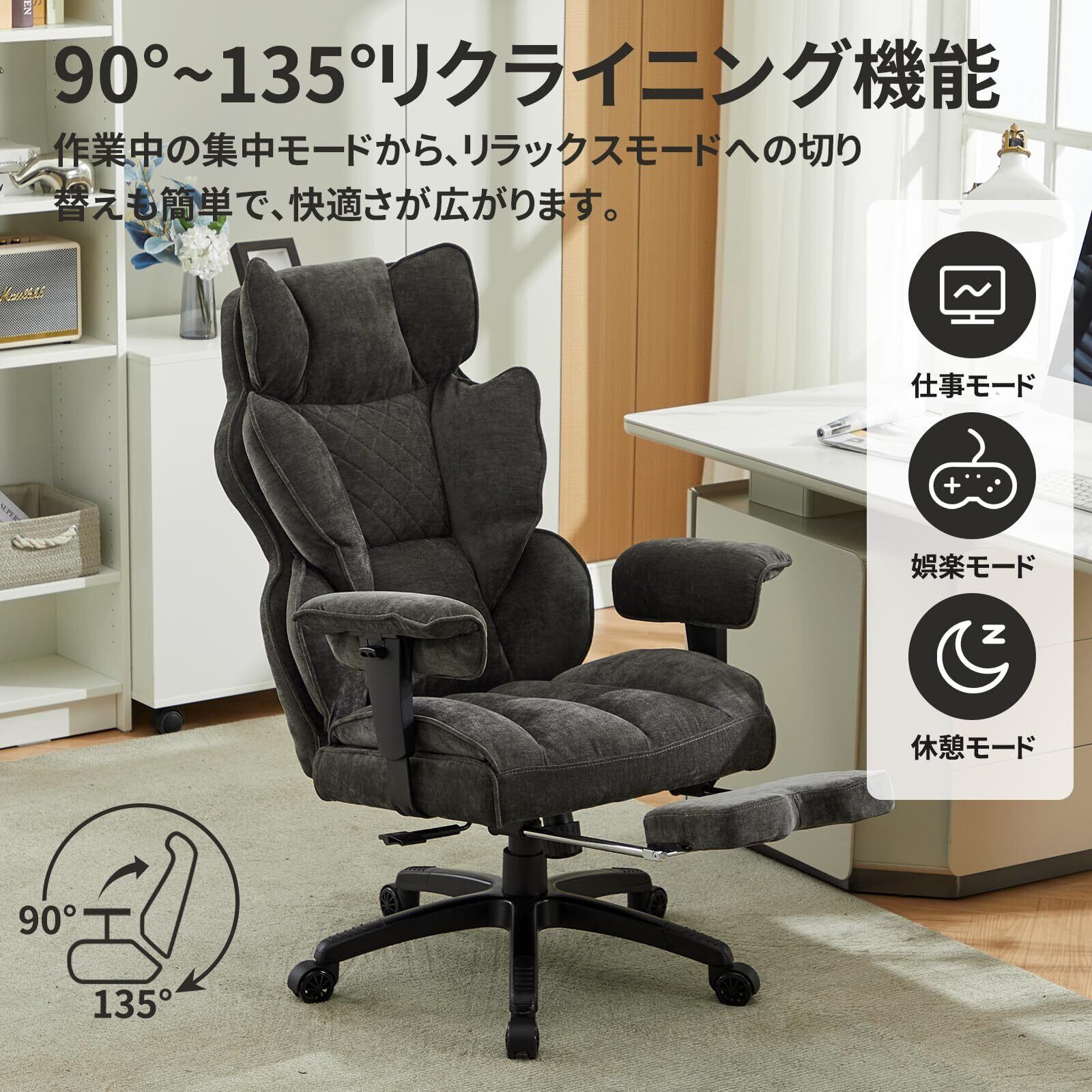 ■特徴: 広々座面、通気性ファブリック生地、低反発クッション、135°リクライニング、ランバーサポート、180kg耐荷重