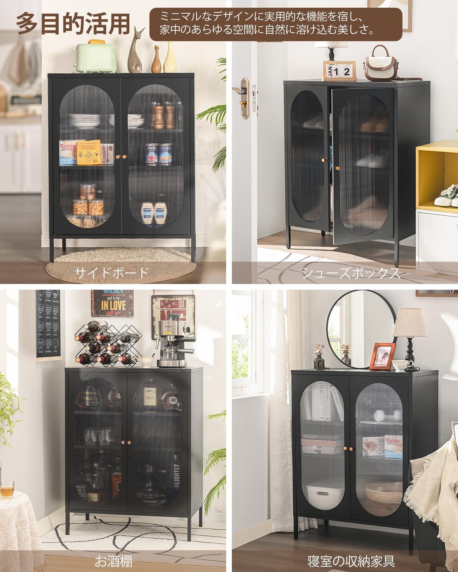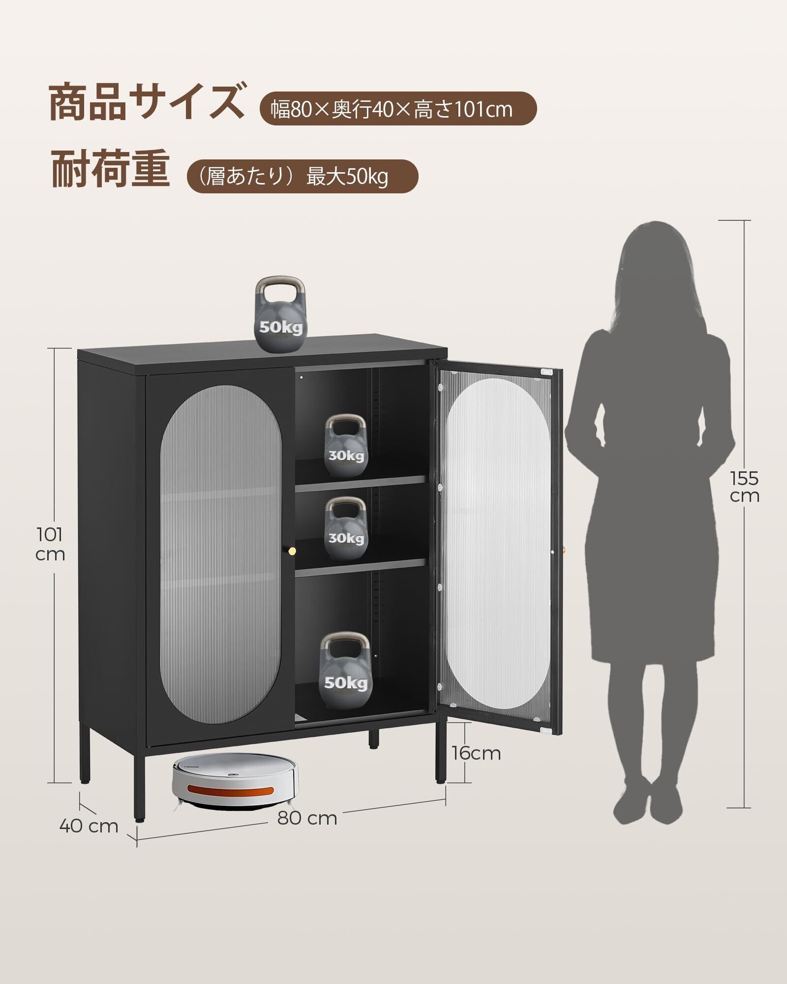 ご家庭の空間に素敵なアイテムを:散らかった物品のための“隠れ家”をお探しですか?LANDVOIの収納キャビネットは、多種多様な物品を収納可能。調整可能な棚設計が強力な整理収納機能を実現し、食器、食品、ワインボトル、衣類、日用品など様々なものを整頓できます。半透明ドアパネルのデザインは、乱雑さを隠すだけでなく、美観性もプラス。まさにリビング収納に最適な棚扉付きのリビングボードとして、生活空間を彩る棚収納扉付きキャビネットです。 品格ある仕上がり:この扉付き棚のキャビネット本体は鉄鋼製で、とにかく頑丈で耐久性を追求!各棚板は最大60kgまで耐荷重。鋼材は複数の環境配慮型工程を経て高品質な粉体塗装を施し、優れた防錆性と耐汚性を実現。お手入れは湿った布で拭くだけ。天板には厚さ15cmの高品質パーティクルボードを採用、温もりある雰囲気を演出!鉄と木の融合が、頑丈さと温かみを兼ね備えたオシャレ棚を実現しました。 仕様: カラー:ブラック 材質:スチール 寸法:幅80 x 奥行40 x 高さ101cm 正味重量:18.5kg 棚板1枚あたりの耐荷重:60kg