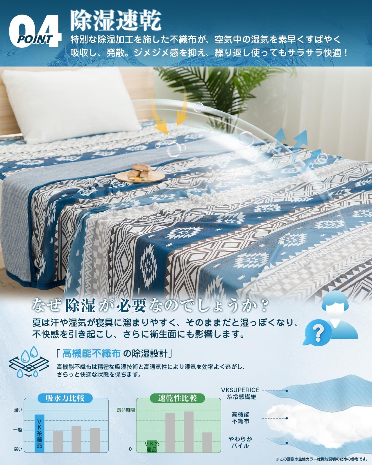 【除湿速乾】夏の寝苦しさは、温度だけでなく、湿気も夏の寝苦しさの要因となる。特別な除湿加工を施した不織布が、空気中の湿気を素早く吸収し、発散する。湿度を50±5%に近づけることでじめじめ感を解消、繰り返し使ってもサラサラ快適!