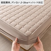 【素材】表地-ポリエステル100%、充填物-ポリエステル100%、裏地-TPU(防水素材)、マチ部分-ポリエステル100%。ほどよい厚みの充填物を充填して、ふんわり心地よい寝心地を実現しました。弾性全周ゴム付きで360°マットレスを包み、滑り止めできます。マチ部分は約30cmになります、厚さ5-28cmのベッド/マットレス/敷き布団に適応できます。しっかり固定ができ、取り付けも簡単です。