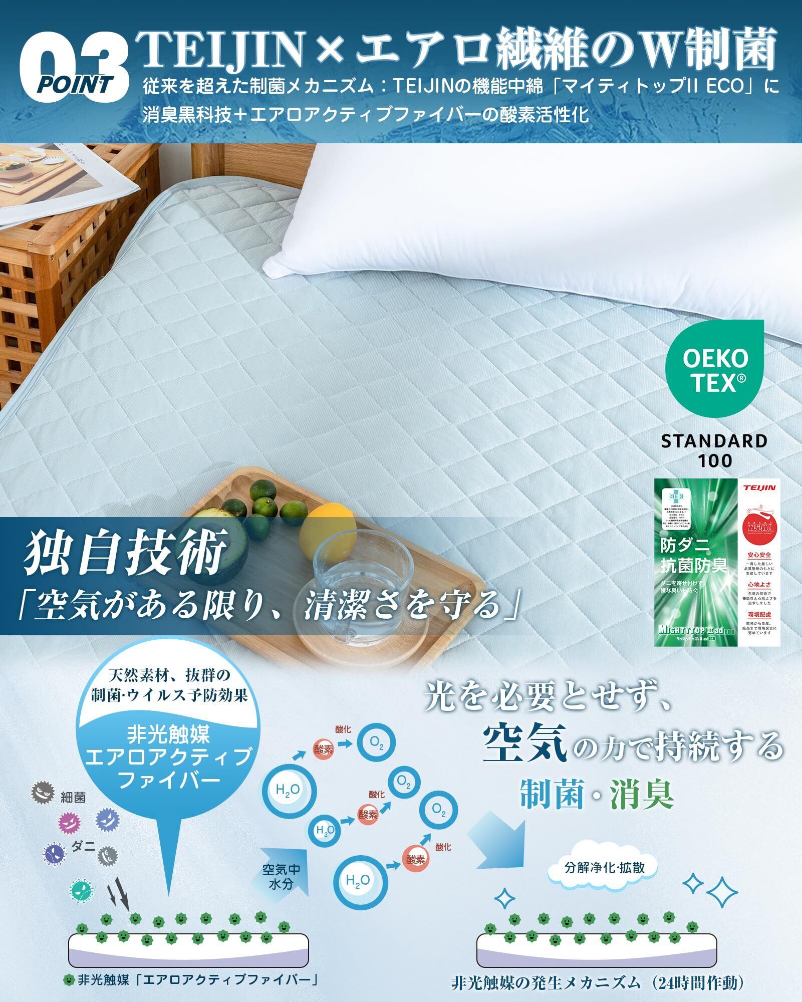 【TEIJIN×エアロ繊維のW制菌】 湿気や汗でジメジメする夏は、菌が繁殖しやすい季節です。中わたにテイジンの機能繊維「マイティトップII ECO」と、エアロアクティブファイバーの酸素活性化の組み合わせで、空気がある限り、24時間持続的に制菌消臭作用を発揮する。低ホルムアルデヒドなのでお子様にも安心。洗濯しても抗菌防臭・防ダニ効果は持続します。
