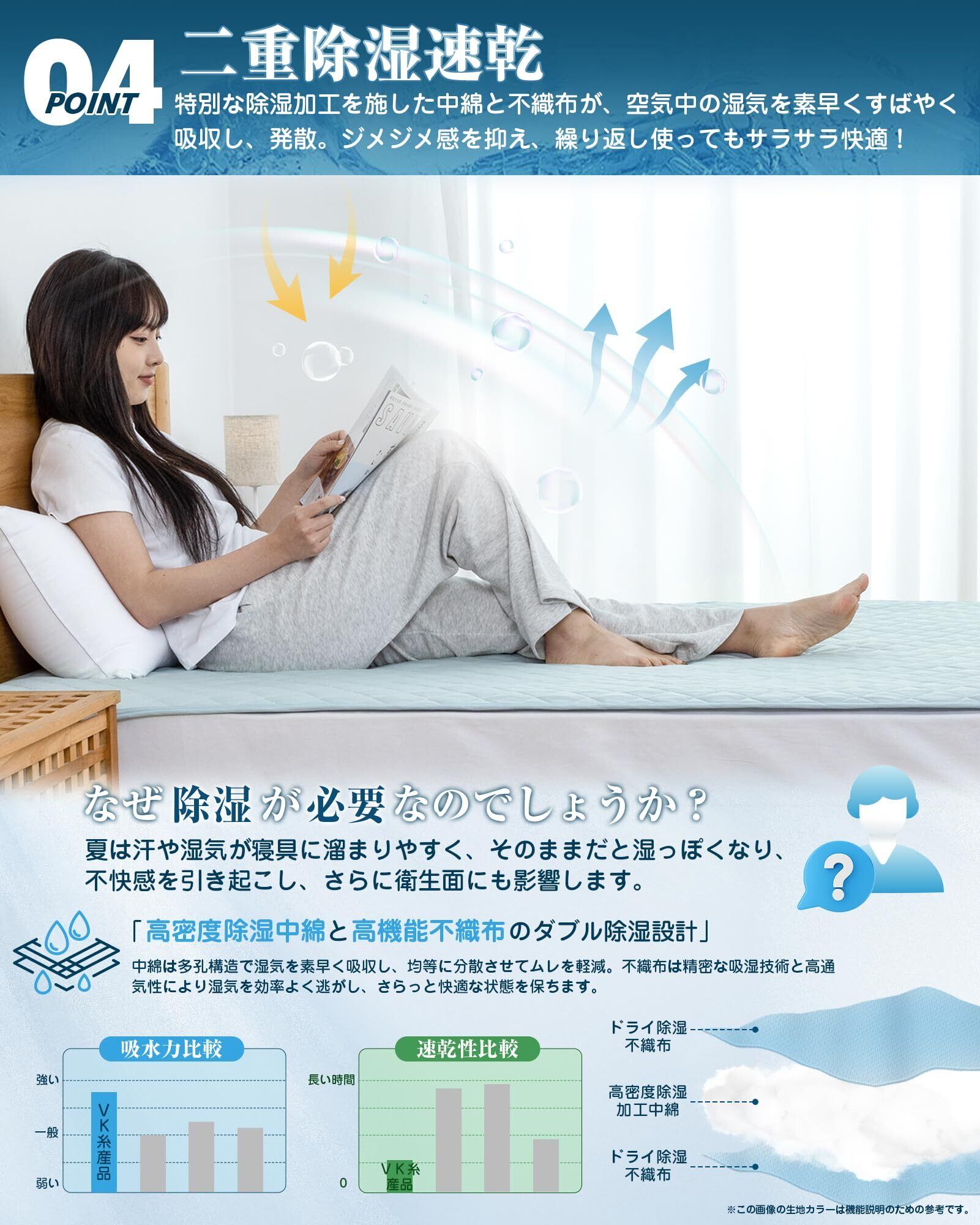 本敷きパッドは帝人TEIJIN中綿を使用しており、冷感機能に優れています。夏場の寝苦しさを軽減し、ひんやりとした寝心地を24時間持続します。また、吸湿速乾機能により夏の湿気をしっかりと吸収し、速やかに乾燥させることで、常に清潔感をキープします。