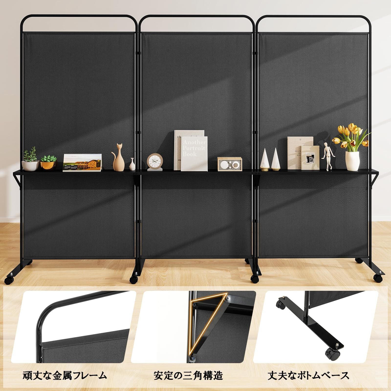 TANGKULA パーテーション 間仕切り 3連 キャスター付き メタル製シェルフ付き 折りたたみ 布タイプ 十分な収納 高さ188cm 幅262cm 目隠し スクリーン 屏風 衝立 軽量 コンパクト収納 寝室 居間 オフィス 事務所 (3連-Black-卓上付き*キャスター付き)