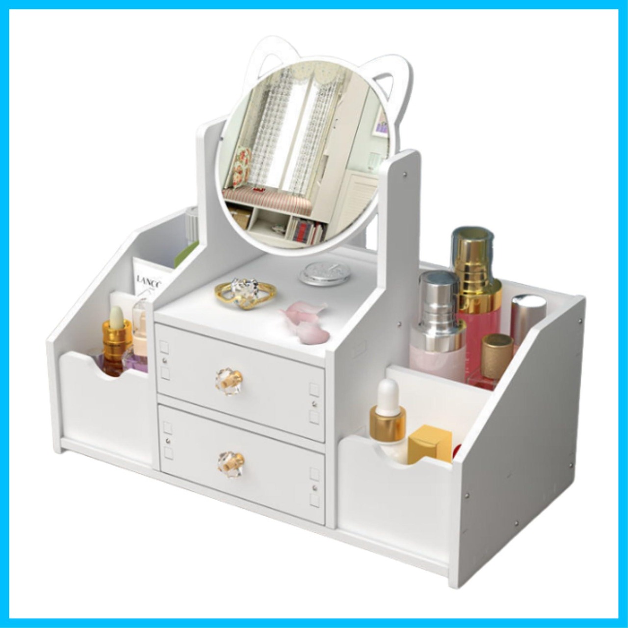 【ミニサイズの可愛いドレッサー】化粧道具や小物入れに使える可愛いミニドレッサーです。シンプルなホワイトカラーで、猫耳や四角デザインのミラーで化粧をお楽しみいただけます。