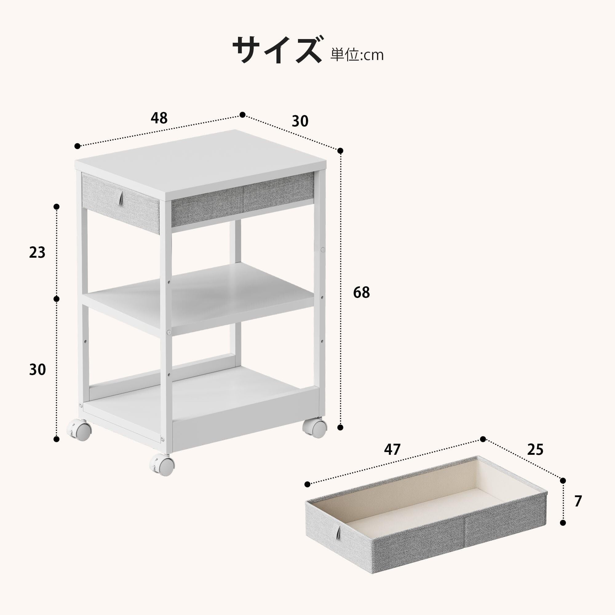 【商品仕様】商品外寸:幅300*奥行480*高さ680mm。本体重量:2.5kg。耐荷重:天板10kg、中段10kg*2、下段10kg。素材:合成樹脂強化合板、オクスフォード。※ご注意※お客様組立商品。