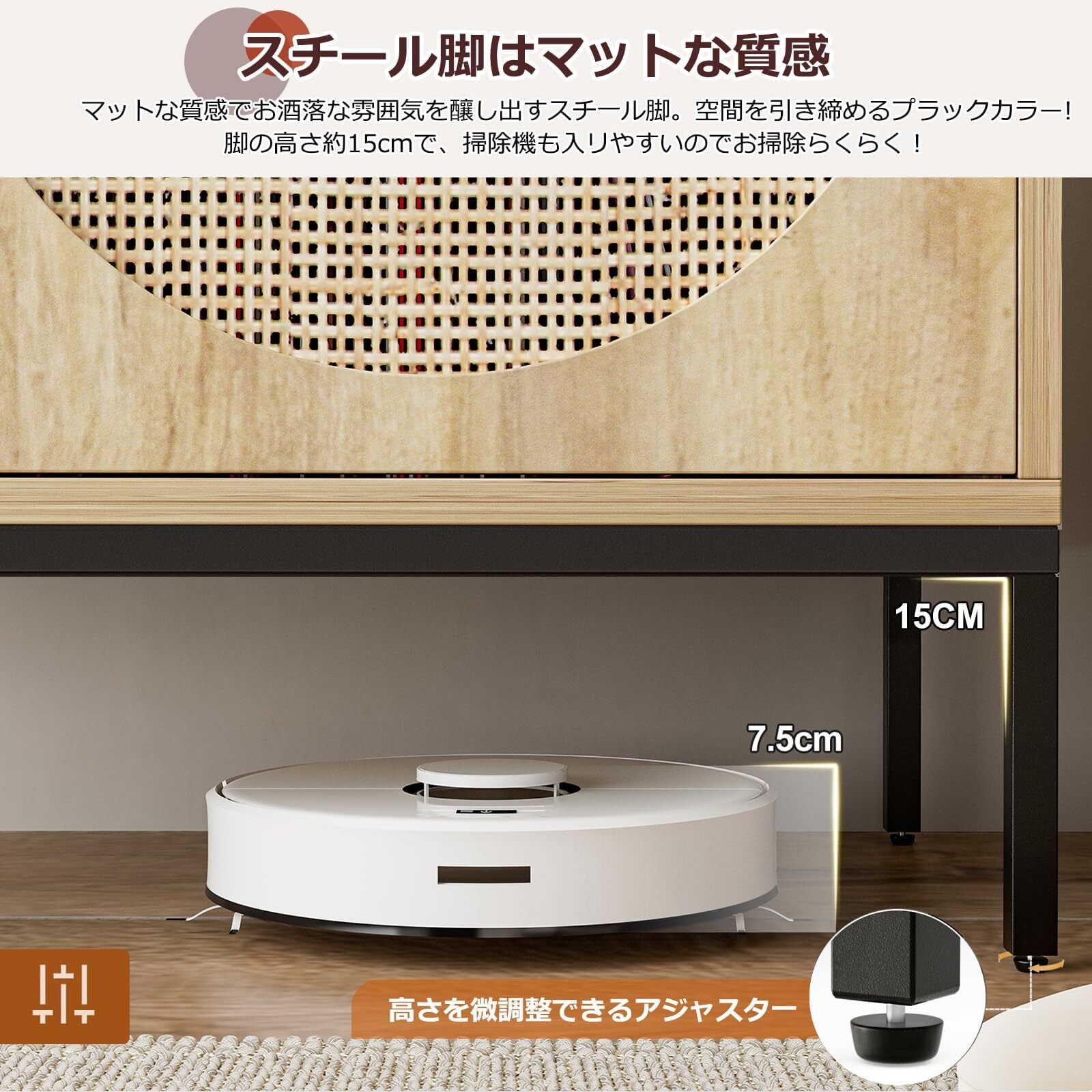 【通気性良&お手入れ簡単】通気性の良いラタン扉で、気になる臭いを軽減します。一年中通気性良く 気を付けていてもこもりがちな臭い。天板は合成樹脂化粧仕上げだから水に強く、汚れにくく、飲み物をこぼしてもさっと拭き上げ簡単。脚の高さは約15cmあり、お掃除もしやすくなっています。