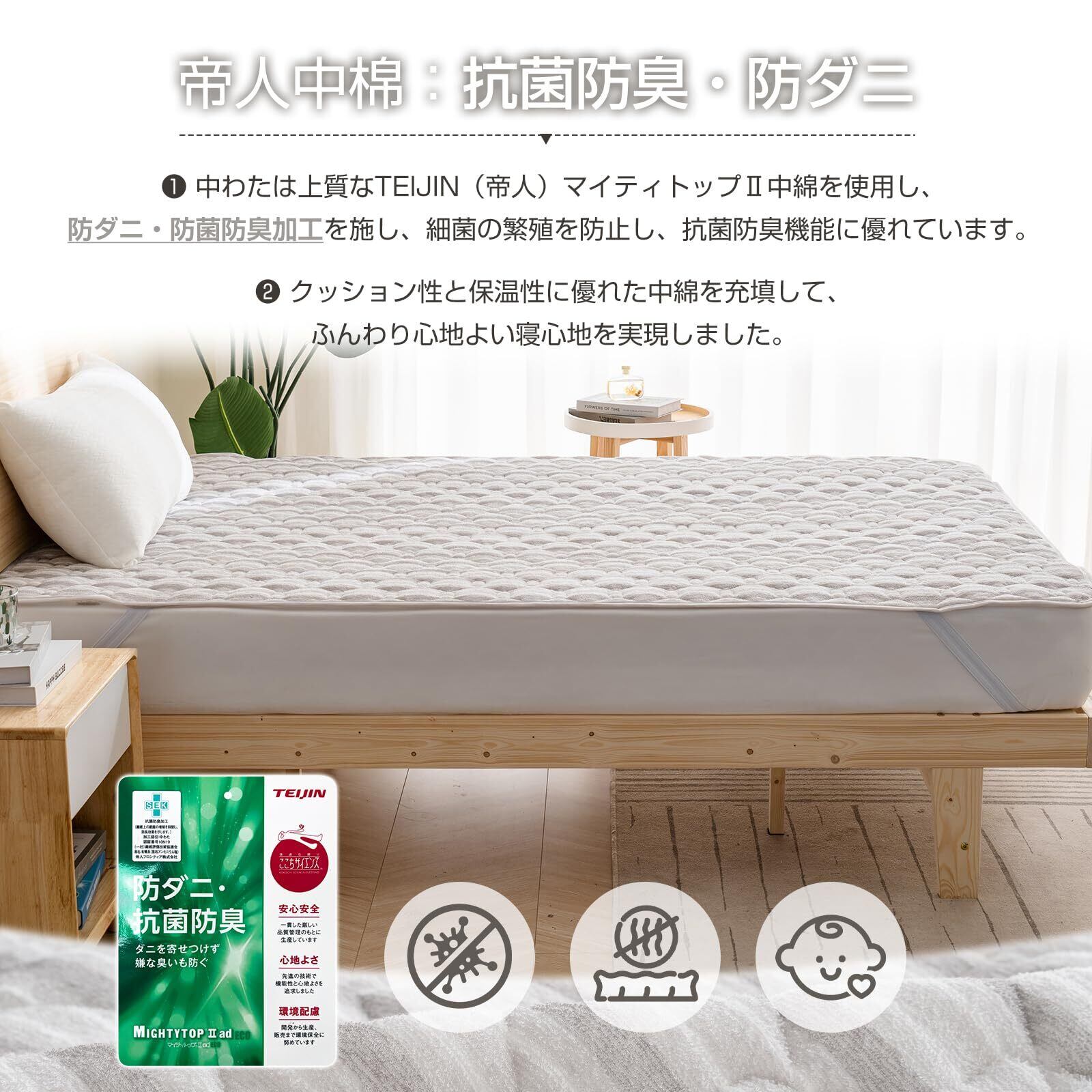 【帝人中綿を使用&SEKマークを取得:抗菌防臭防ダニ】 中わたには上質なTEIJIN(帝人)マイティトップⅡ中綿を使用し、防ダニ・防菌防臭加工を施し、細菌の繁殖を防止し、抗菌防臭機能に優れています。機能が持続し、何度も洗濯した後の効果は依然として新しいものと同じです。SEKマークとは、繊維評価技術協議会が制定する、抗菌・防臭加工繊維製品の性能等における規格を満たした製品に付与する認証マーク。本製品はISO9001認証工場で生産されており、SEK認証を取得しており、安全がされており、低ホルムアルデヒドで小さなお子様にも安心です。