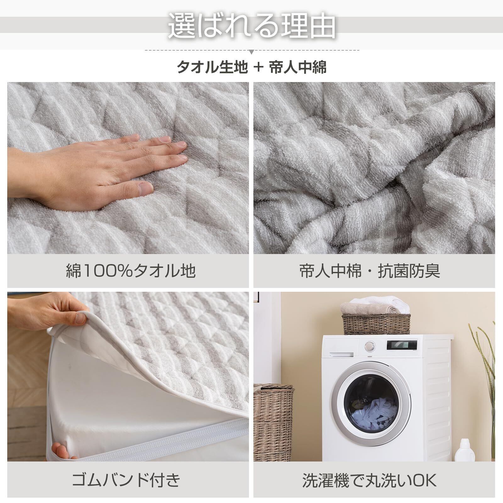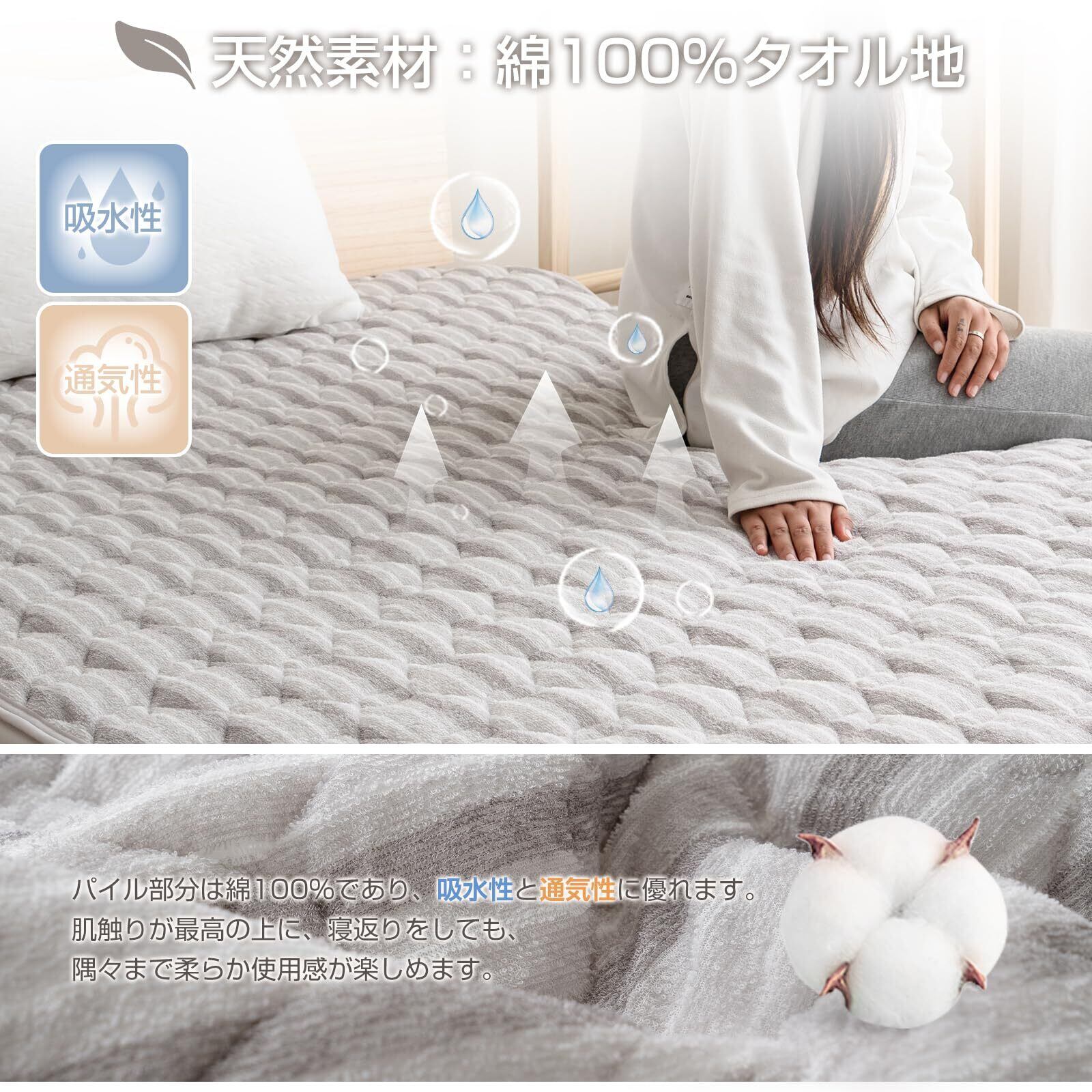 【オールシーズン向け&ゴムバンド付き】タオル生地は人体の皮膚の汗を吸着し、体温を迅速に正常に回復させ、本当に通気性、吸汗効果を達成し、肌に優しくで、四季の使用に適している。敷きパッドの四隅に滑り止めのゴムバンドが付いていて、敷きパッド をマットレスにしっかり固定できる。ゴムバンドを使用しているので、より美しくなる。お洗濯の際の取り外し&取り付けも簡単なので、使いやすくて、家事の負担も軽減してくれる。