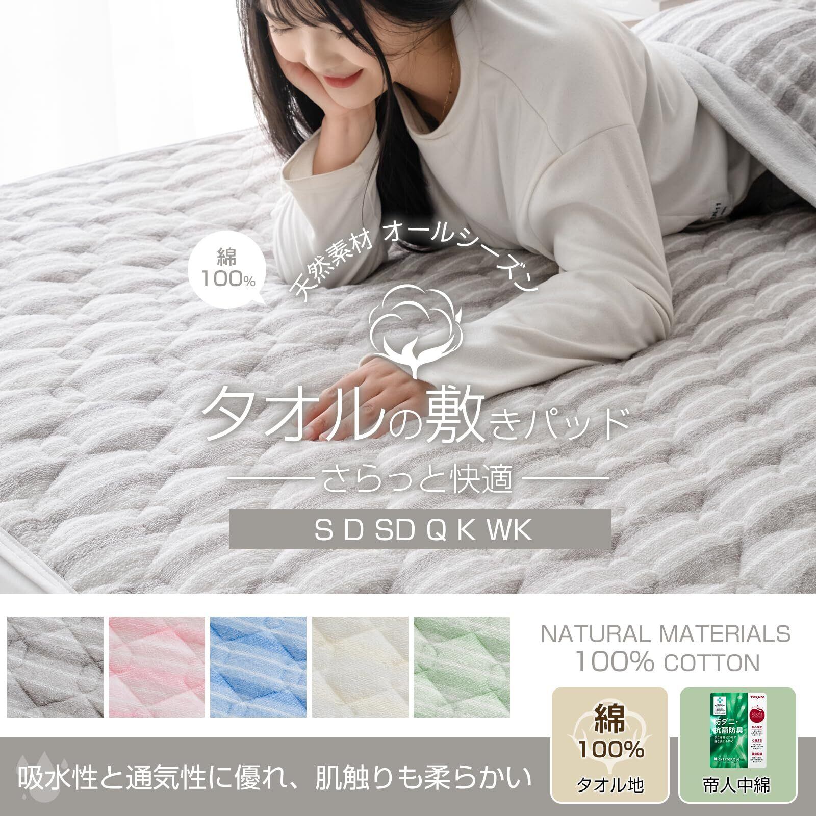 ■特徴: 綿100%・タオル生地・TEIJIN マイティトップⅡ繊維使用・シングルサイズ・洗える・抗菌防臭・防ダニ・ズレにくい・四隅ゴム付・丸洗いOK・SEK認証・天然素材