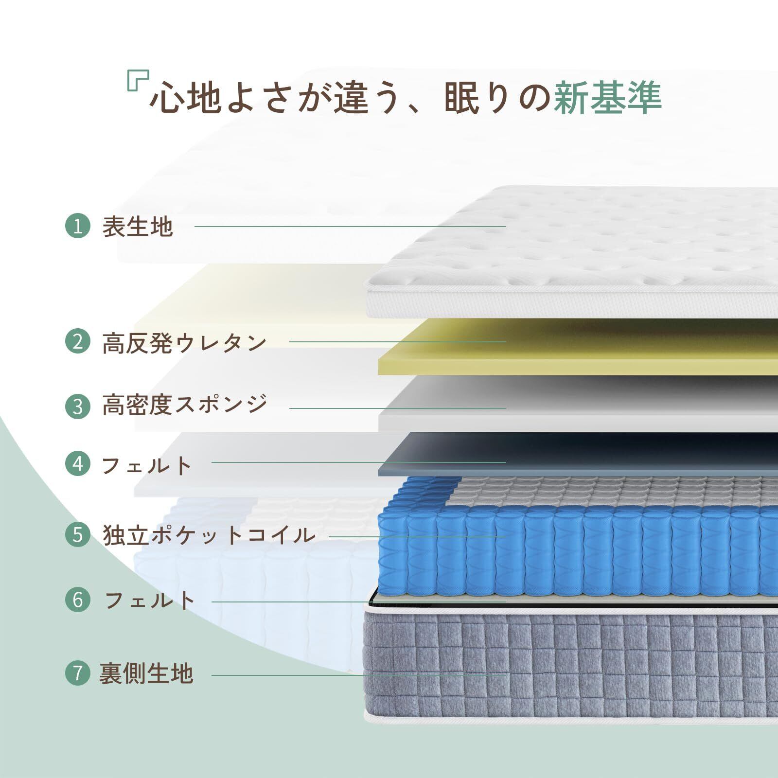 【最高の寝心地】本マットレスは7層構造を採用し、豊富な素材を使用した厚さ24cmの高反発マットレスです。ポケットコイルは独立して配置されており、理想的な寝姿勢を維持します。振動が伝わりにくく、静かな夜の睡眠を実現します。