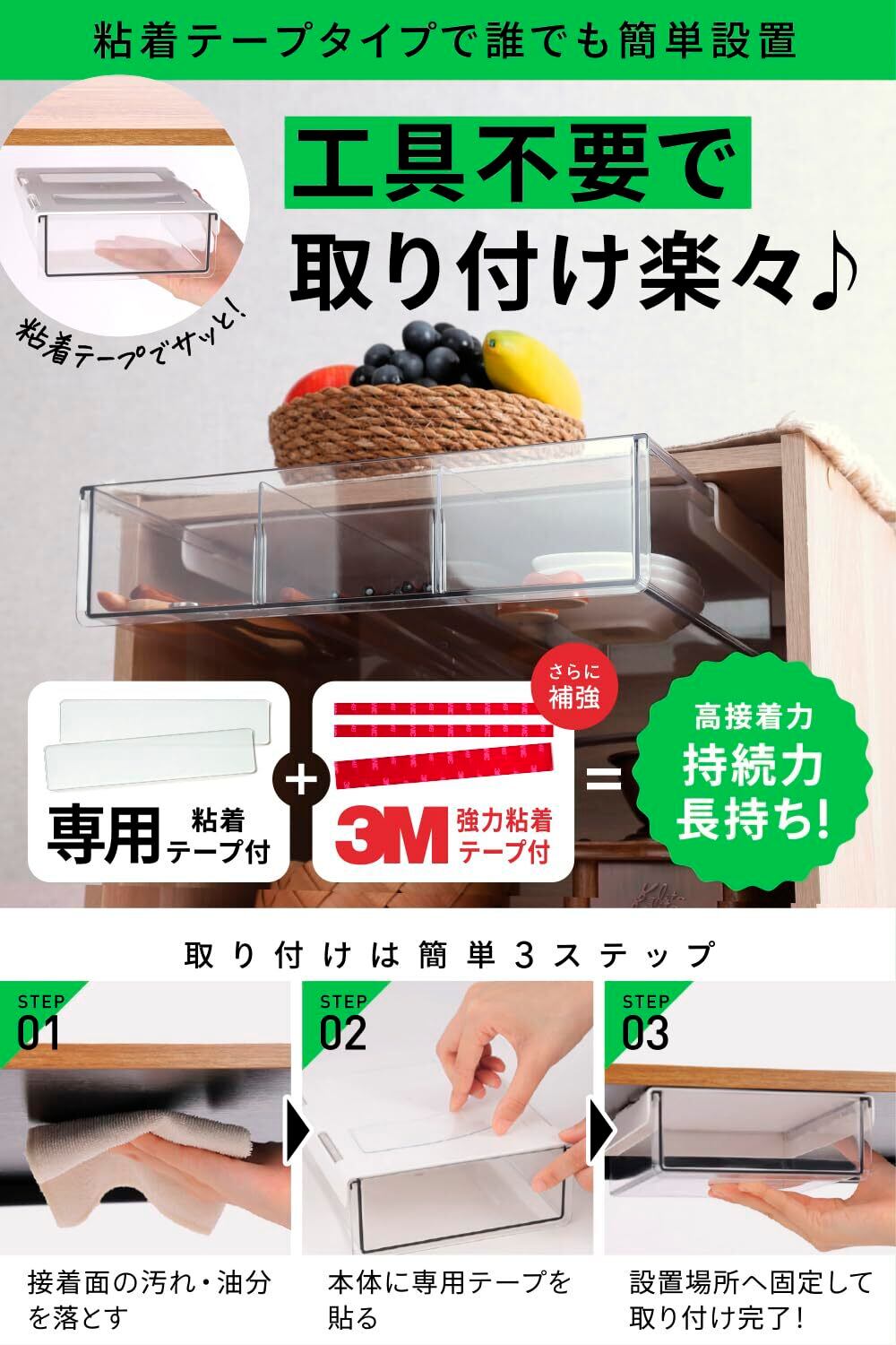 ■特徴: 工具不要・透明・デスク下・冷蔵庫・貼り付け式・収納専門家監修