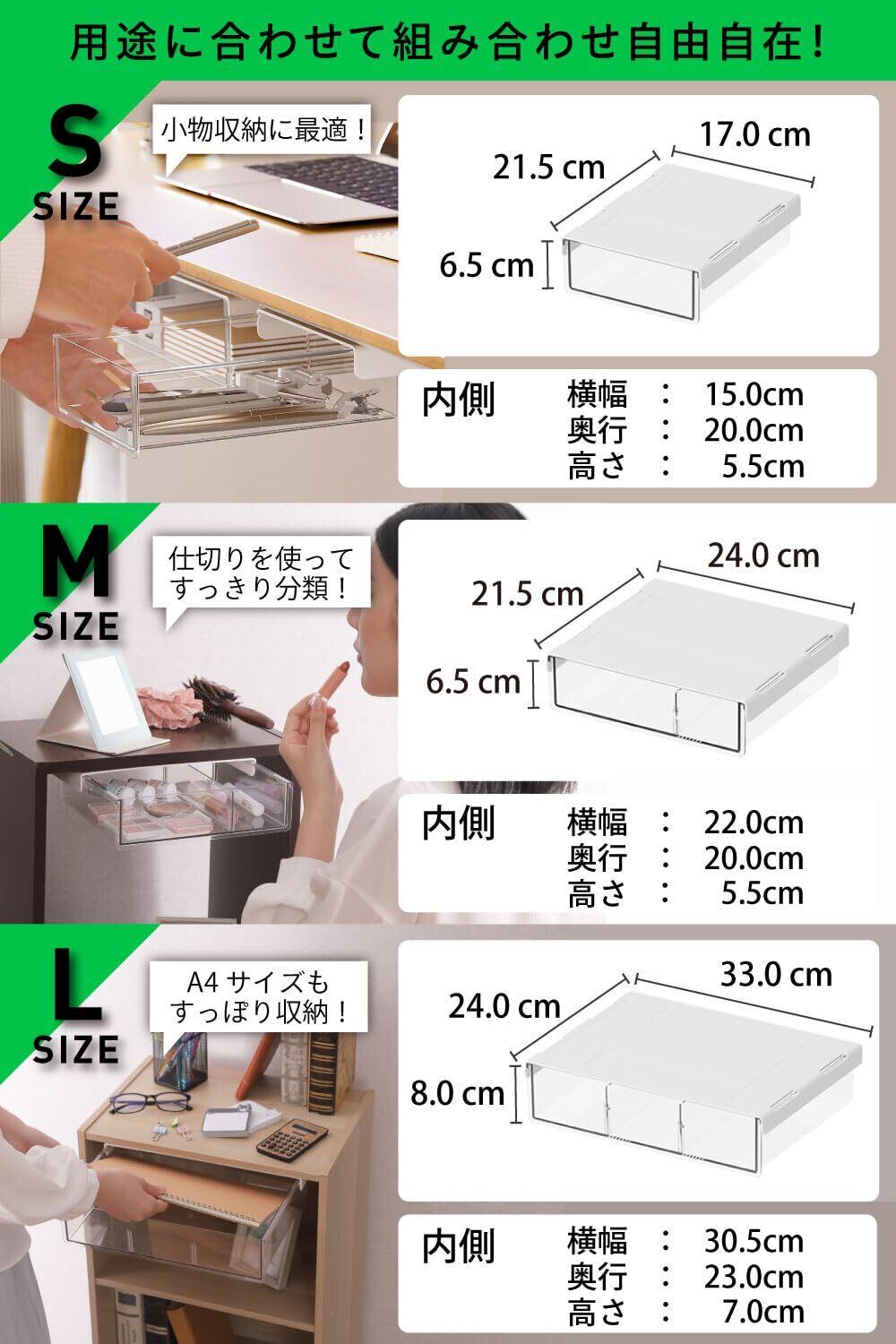 デスク下はもちろん、キッチンやリビング、バスルームなど、様々な場所で活躍します。小物や掃除道具の収納、書類や文房具の整理など、一つあれば多用途にご利用いただけます。