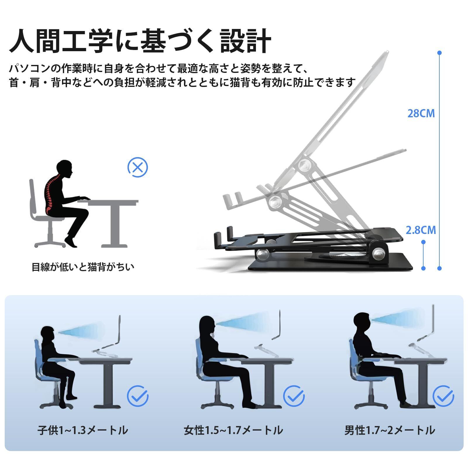 無段階高さ・角度調整可能&人間工学設計:pcスタンド ノートパソコンの作業やipad スタンドを使用する場合、パソコン台 斜め 、ノートパソコン·スタンド高さは28 mmから280 mmの間で調整でき、角度は0度から180度の間で無段階に調整でき、パソコン pc台座は360度回転でき、机 高さ調整、大人も子供も老人も、自分の最適な角度と高さに合わせて無段階で自由に調整でき、長時間の作業や学習で背中や首を傷つけるのを防ぐことができます。タブレットスタンド、ノートパソコン アームは人間工学に基づく「Z」型設計で、パソコンと人の視線を一致させ、正しい姿勢でタイプを打つことができ、作業のスピードと効率を高め、姿勢を改善するだけでなく、腰痛、肩こり、頸椎疲労、猫背などを解消することができます