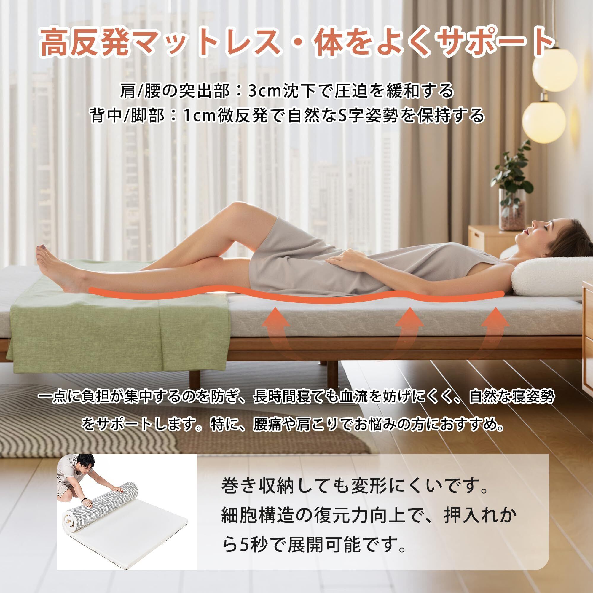 【高反発サポート】 :このマットレスは体の凹凸に合わせてフィットし、肩・腰・背中などの圧力ををよくサポートします。一点に負担が集中するのを防ぎ、長時間寝ても血流を妨げにくく、自然な寝姿勢をサポートします。特に、腰痛や肩こりでお悩みの方におすすめ。