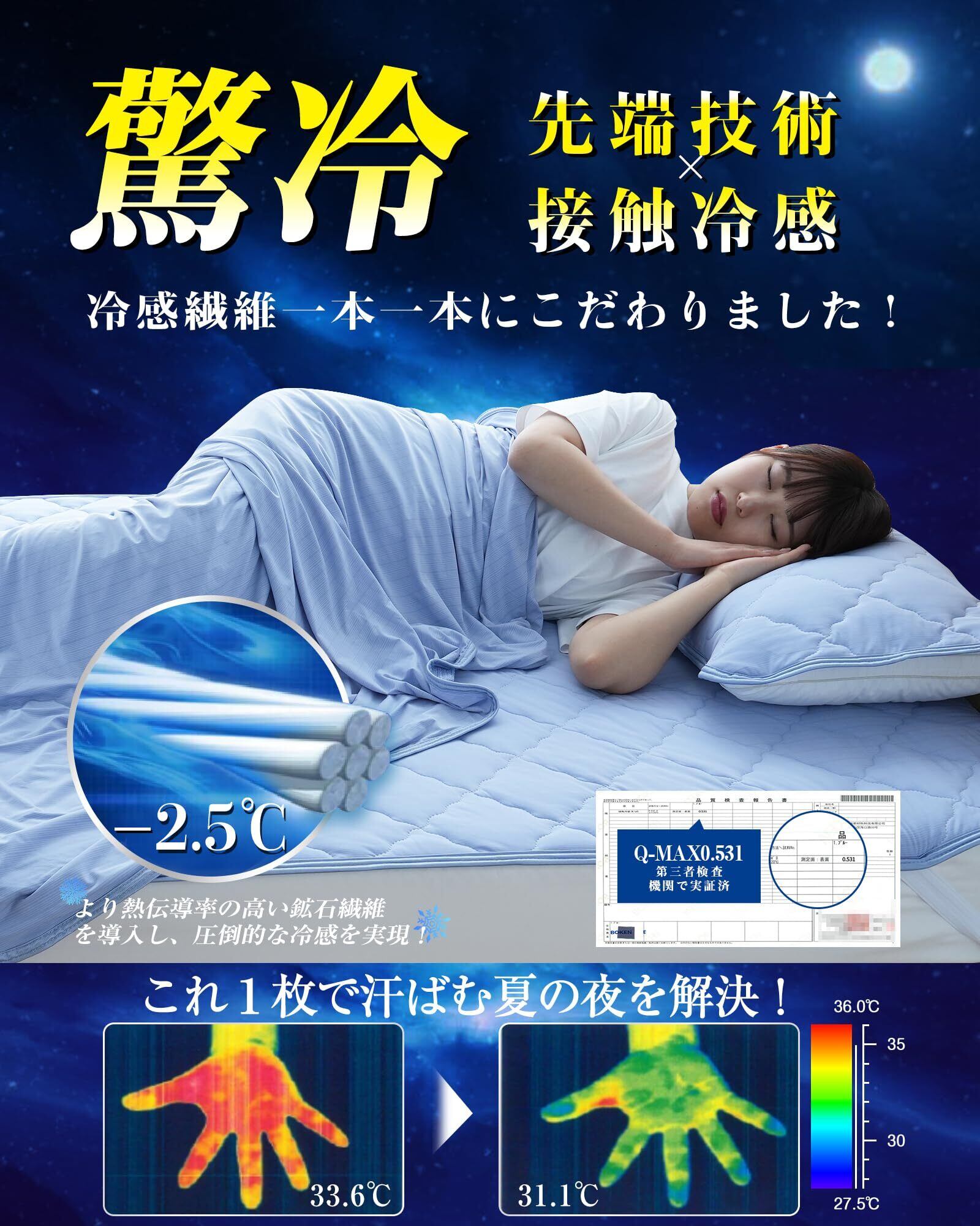 【先端テクノロジー搭載×業界最高Q-MAX値 冷感敷きパッド】究極の冷感を求め、の冷感 敷パッドは先端技術瞬涼糸を使用、冷感繊維一本一本にこだわりました。業界最高レベルの接触冷感値0.531(Q-MAX最大熱吸収速度W/㎠)で、究極の冷たさを実現!※接触冷感(q-max:W/㎠)基準0.2の約265%の究極冷感値。さらに、冷感面は10%のポリウレタン入りなので、より熱伝導率の高い鉱石冷感繊維を導入し、W冷感効果で圧倒的な冷感を実現!一瞬触って冷たいだけではなく、寝返るたびに『ひんやり』が復活!驚きのスピード冷感敷きパッド。夏でも快眠!朝まで快適な眠り!
