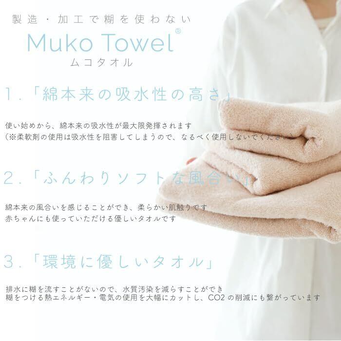 【人のお肌と環境に気づかったムコタオル】ムコタオル(=無糊タオル)は、製造工程で糊を使用せずに作りました。一般的なタオルは綿糸に糊をコーティングしないと織ることができませんが、新田タオルは糊を付けずに織ることができます。その工程を省くことで綿本来の優れた吸水性と風合いを保ち、一般的なタオルに比べて、ソフトな風合いに仕上がっています。