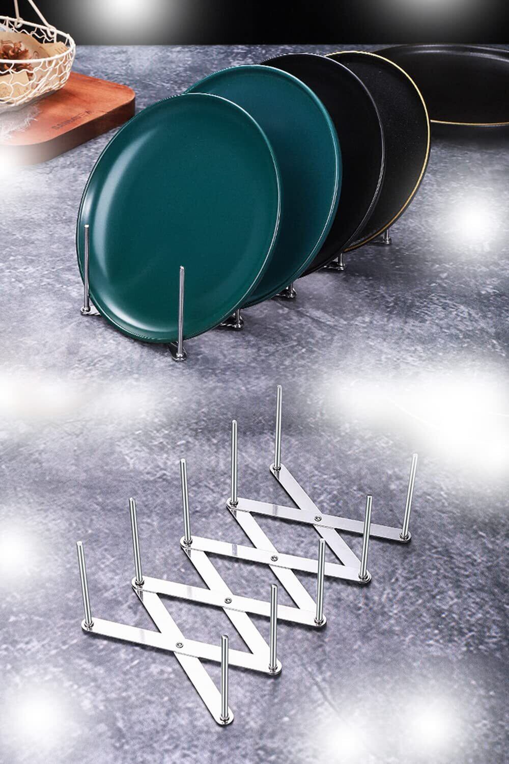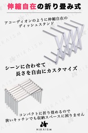 【伸縮自在の折り畳み式】アコーディオンのように伸縮自在のディッシュスタンドです。シーンに合わせて長さを自由にカスタマイズできます。コンパクトに折り畳めるので、狭いキッチンでも収納スペースに困りません。