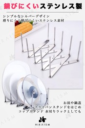 「HIRAISM ディッシュスタンド」は、鍋蓋やプレートをスッキリ収納できるオーガナイザーです。シルバーカラーとスタイリッシュなデザインは、どんなキッチンにもぴったりフィットし、整理整頓をサポートします。